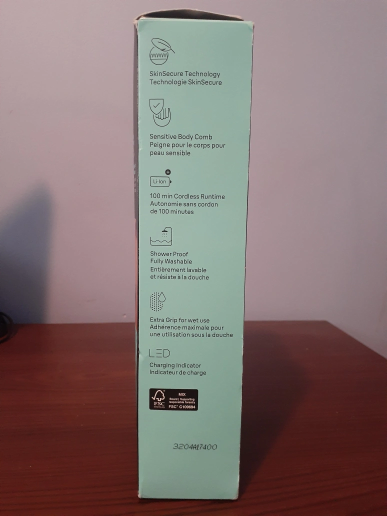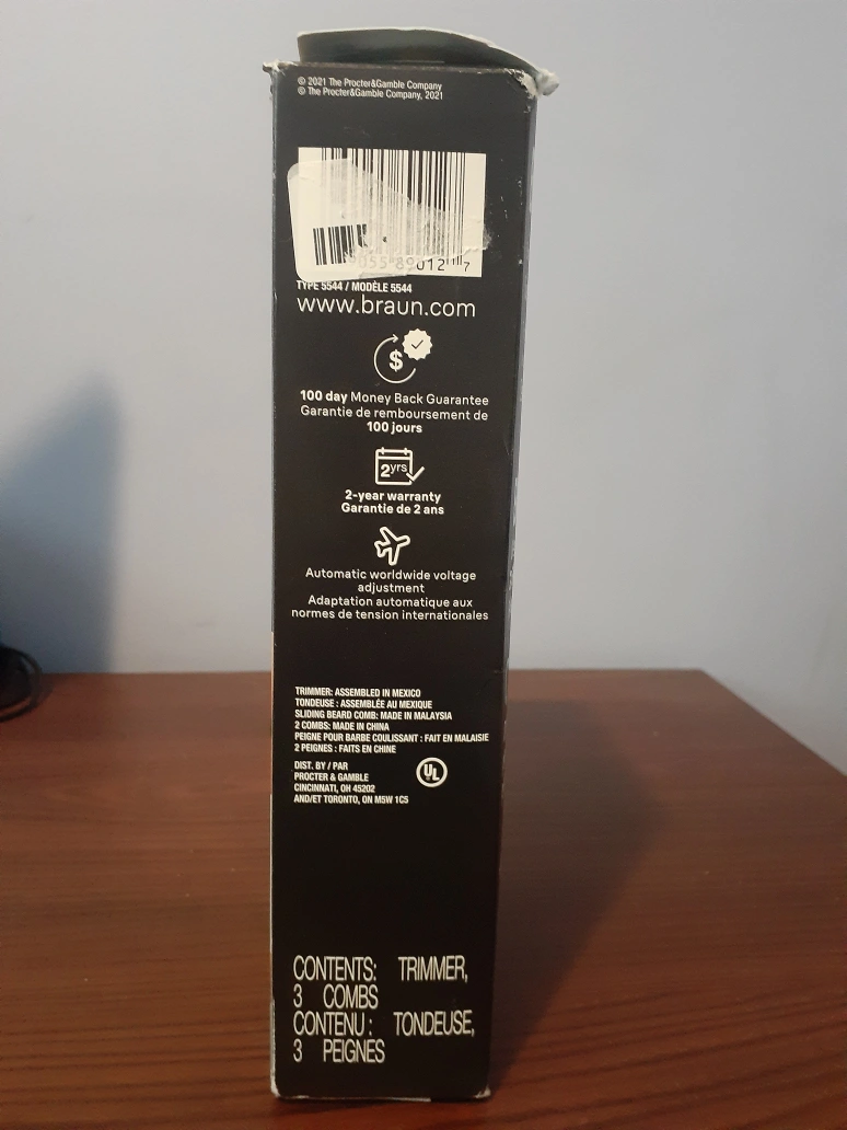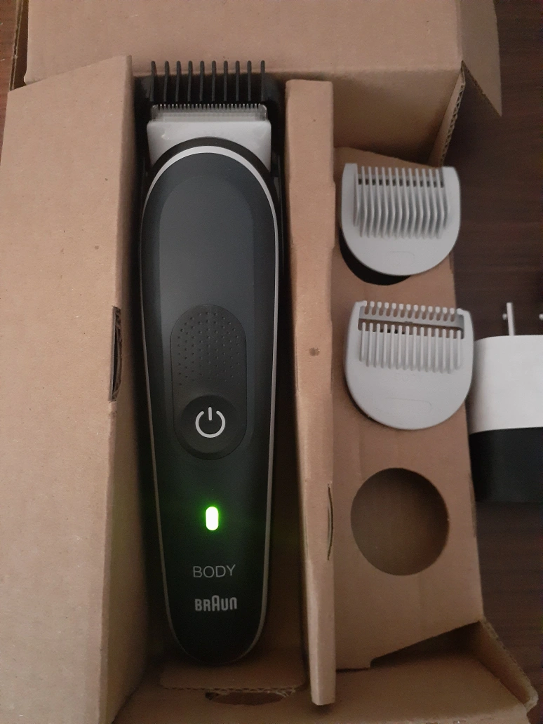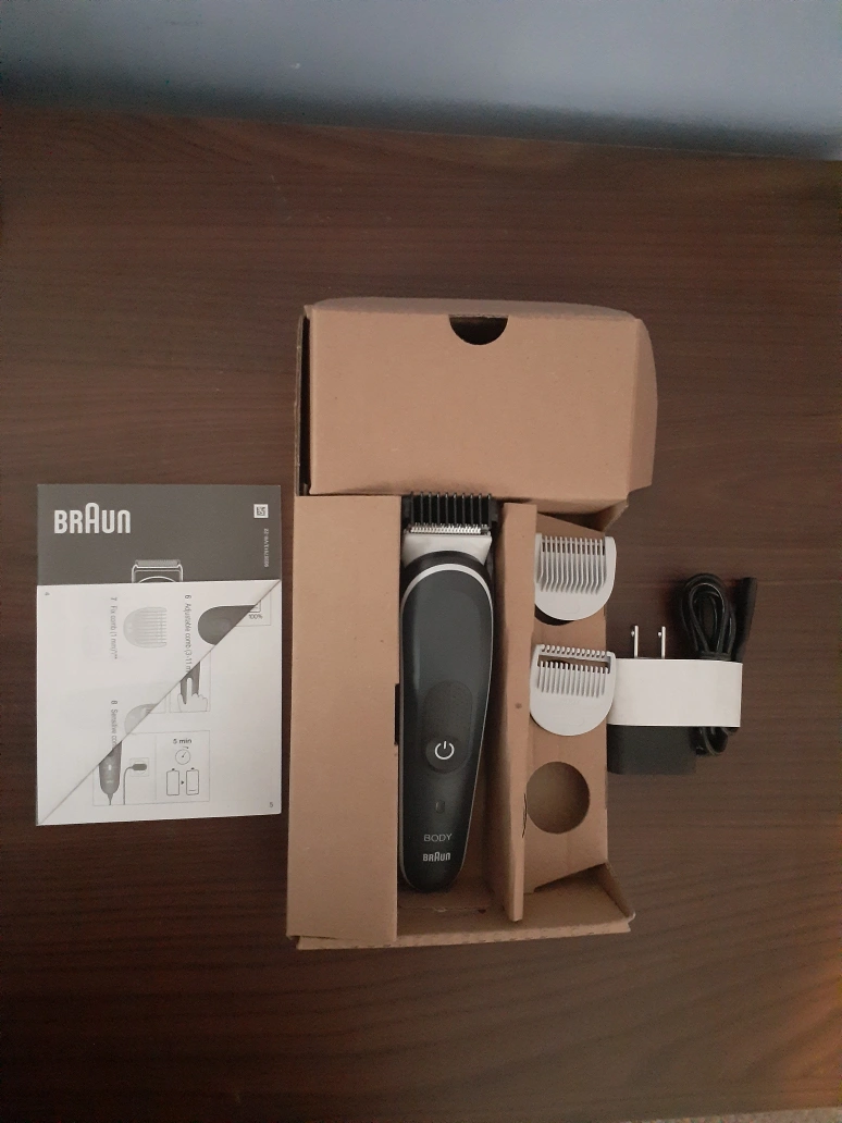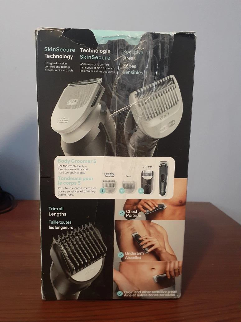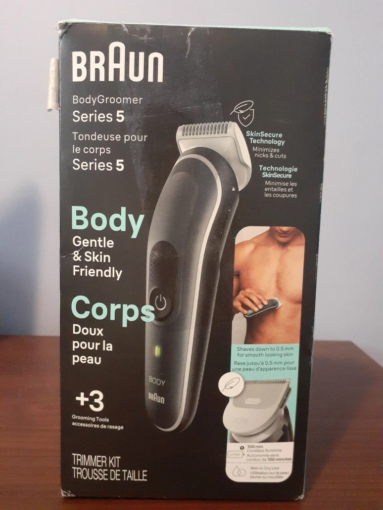 New Braun BodyGroomer Series 5 trimmer kit. Includes trimmer, 3 combs, and charging cord. Features SkinSecure technology. 100 minutes cordless runtime. Shower proof. Gentle on skin.