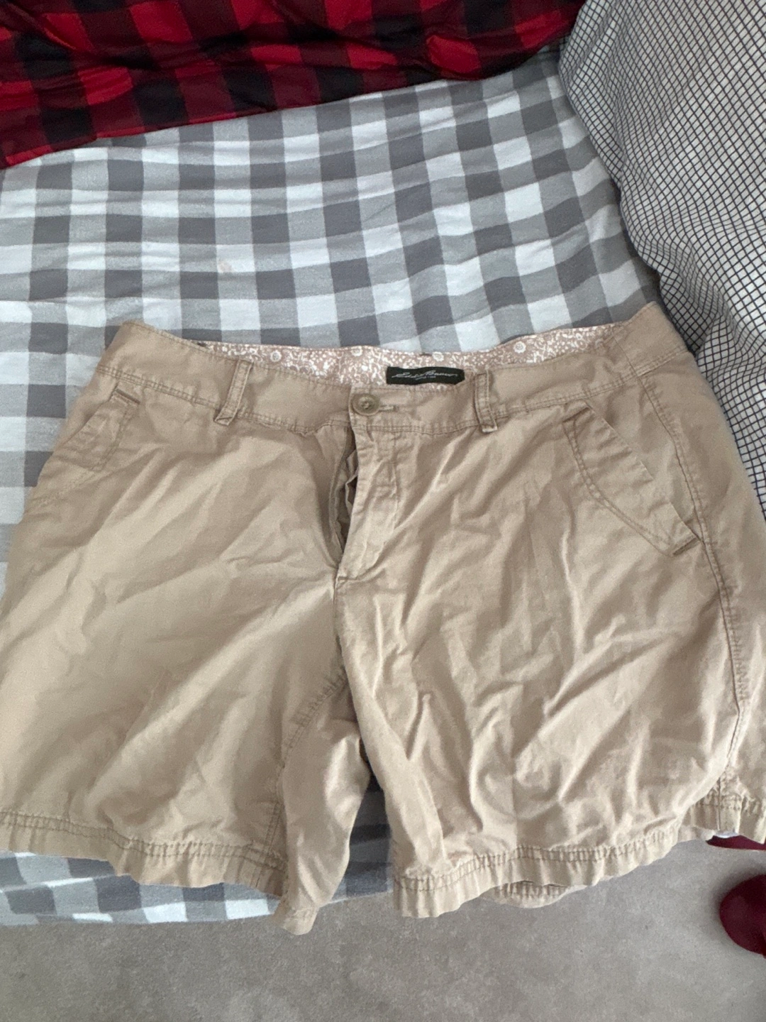 Women's khaki shorts. Size 10. Made in Sri Lanka. Two pockets. Button and zip closure.