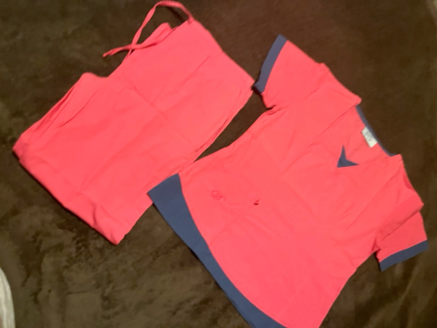 Two-piece scrub set. Pink top and pants. Short sleeves. V-neck top. Darker pink/purple accents. Drawstring pants.