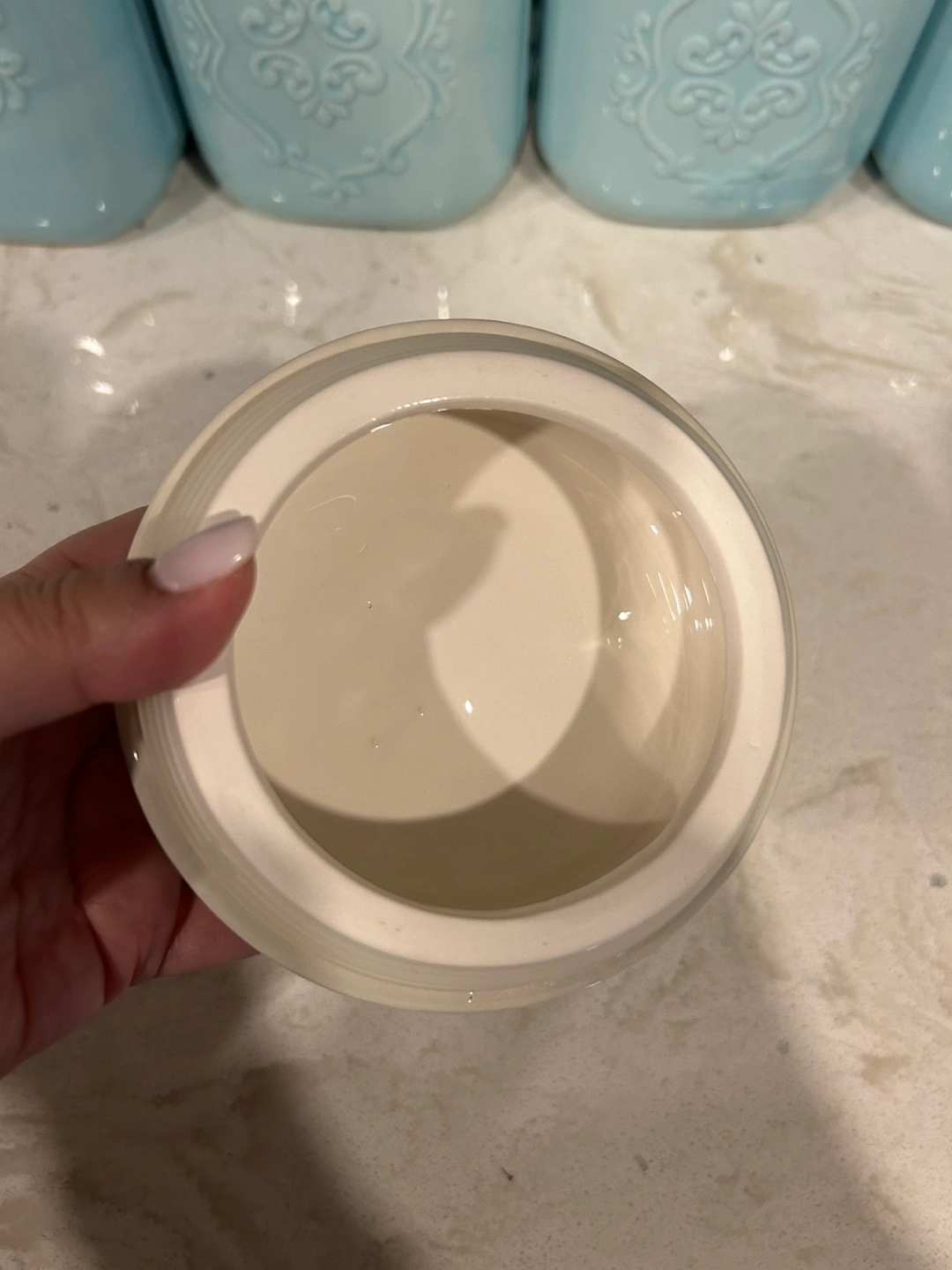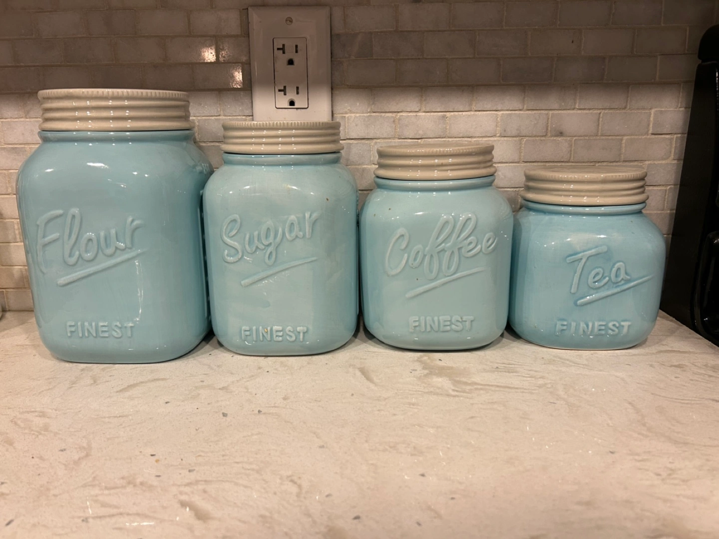 Four light blue ceramic canisters with off-white lids. Elegant design. Perfect for storing sugar, flour, coffee, and tea.
