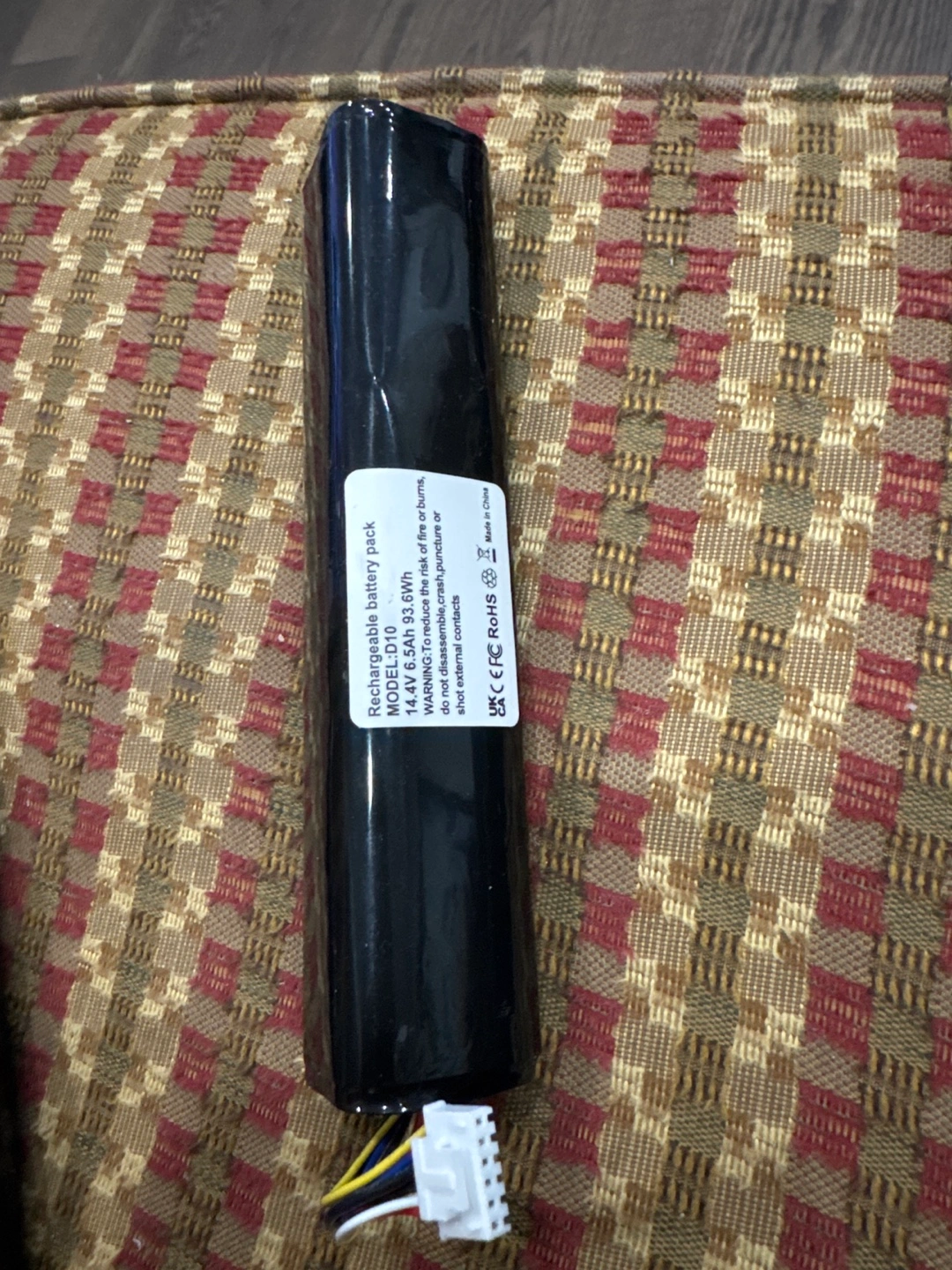 14.4V 6.5Ah 93.6Wh rechargeable battery pack. Model D10. Made in China.
