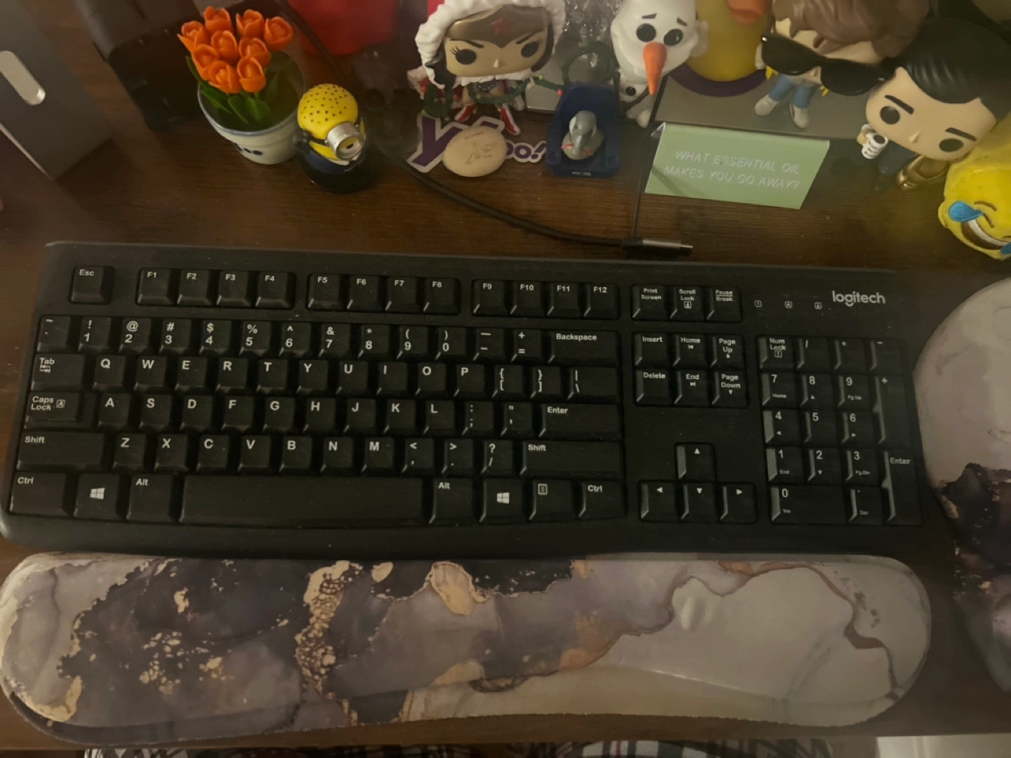Wired keyboard with number pad. Includes marble-patterned wrist rest. Good condition.