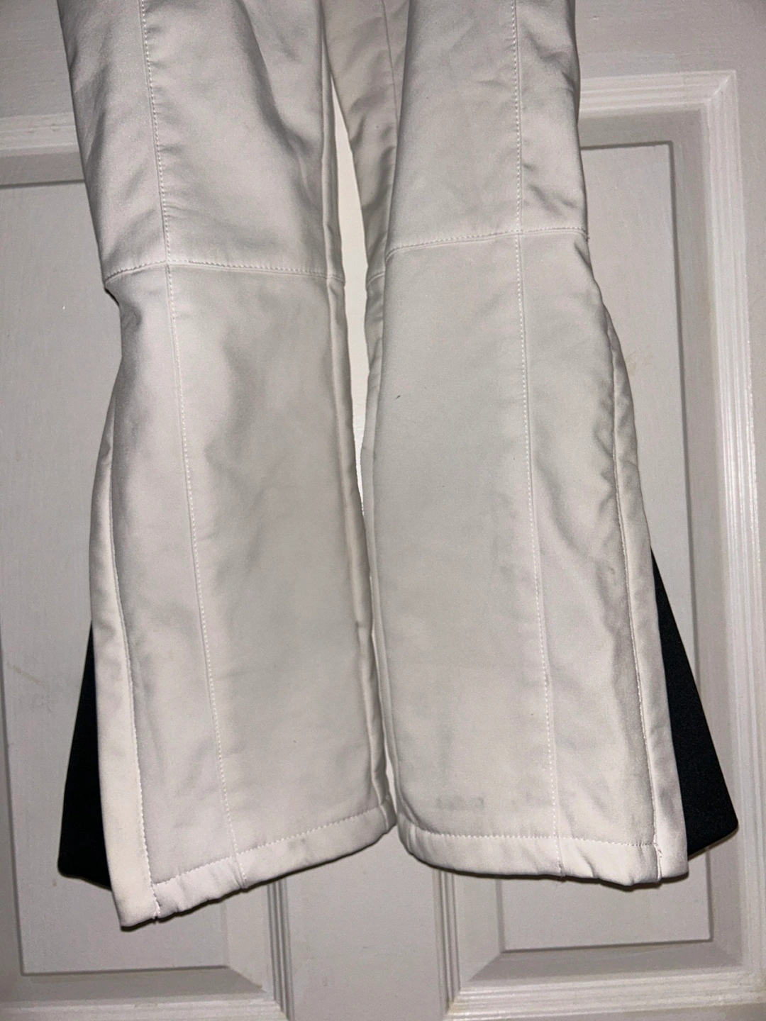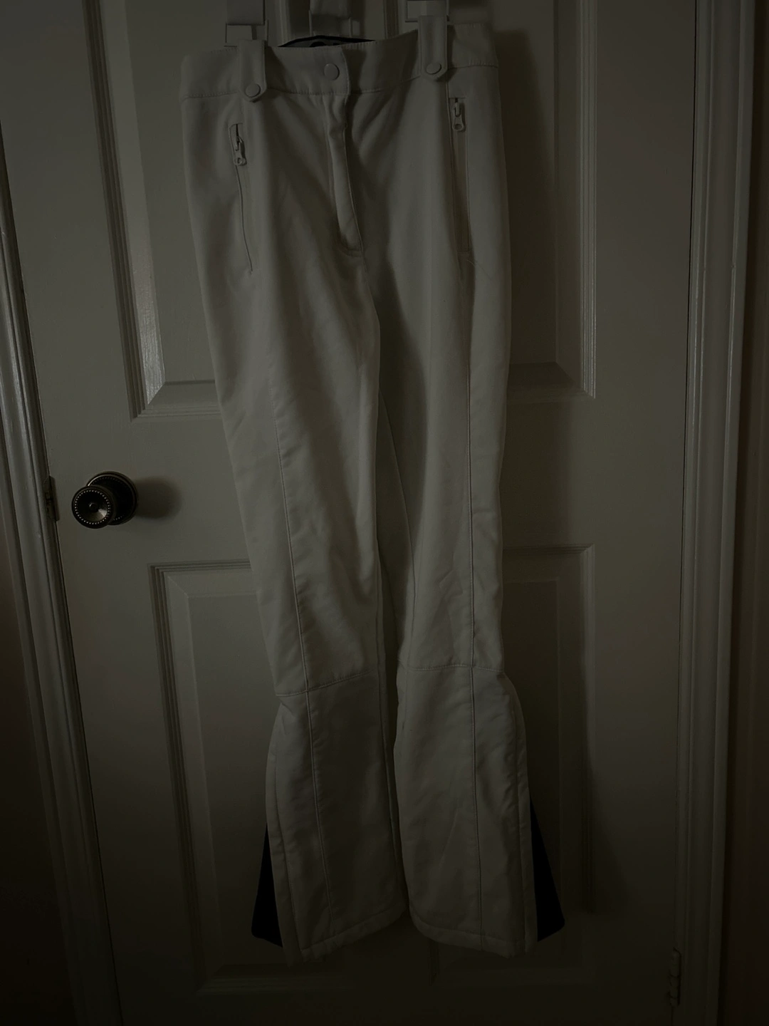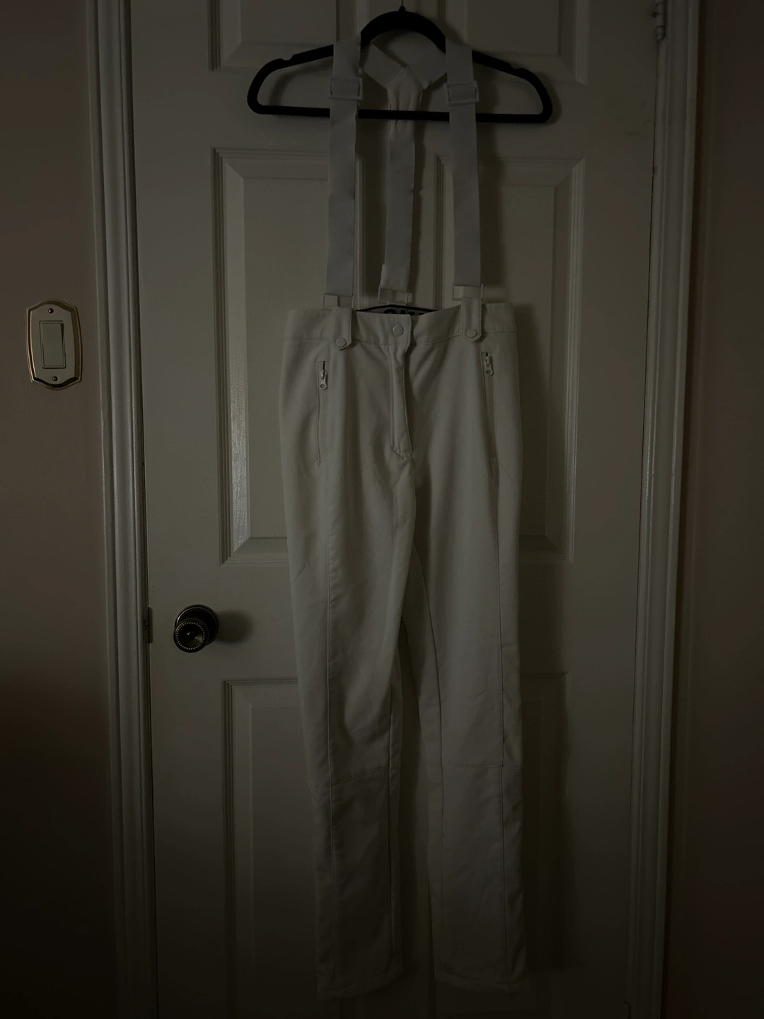 White ski pants. Features suspenders and zippered pockets. Side zippers at the bottom. Excellent for skiing or snowboarding. โท๏ธ๐ โ๏ธ๐จ๏ธโ๏ธ๐๐ฐ