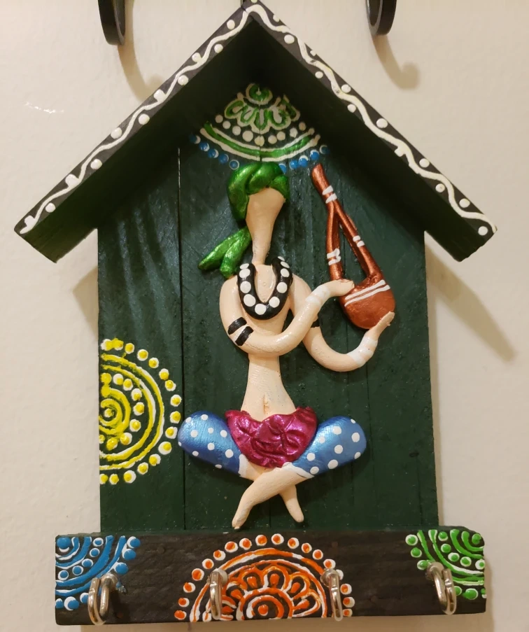 Unique key holder. Hand-painted wooden design. Features a musician figure playing a stringed instrument. House-shaped design. four keys hooks.