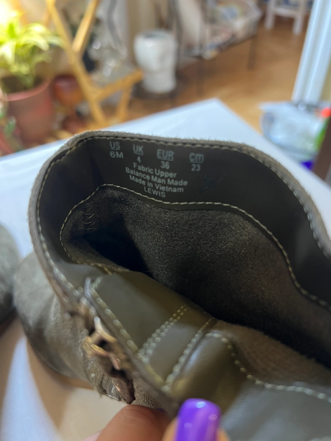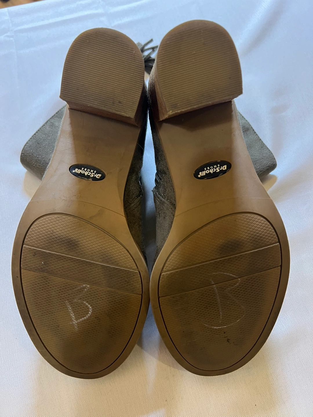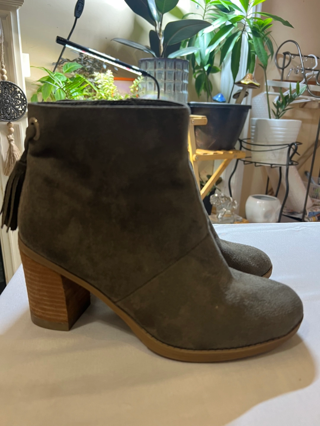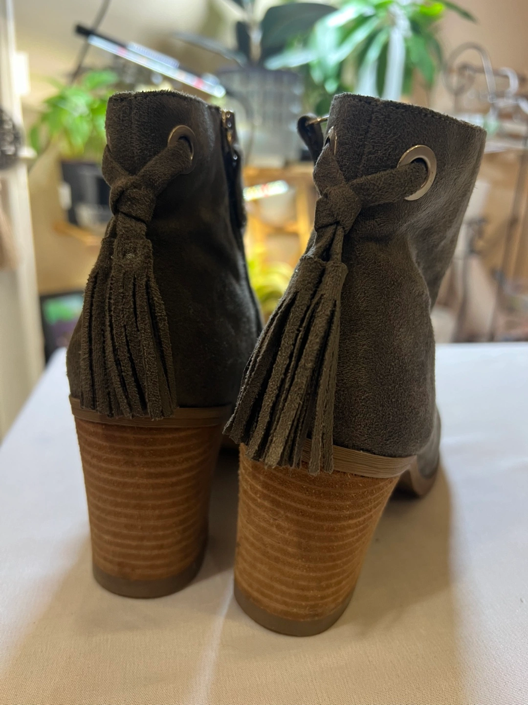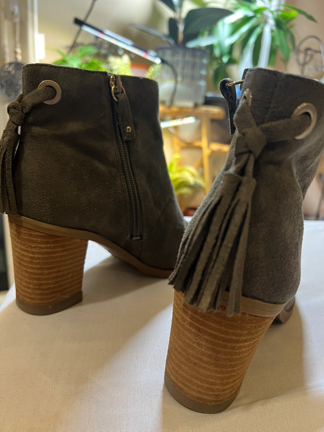 Olive green suede ankle boots. Block heel. Side zipper. Tassel detail at back with a size zipper. Very comfortable! 6M.