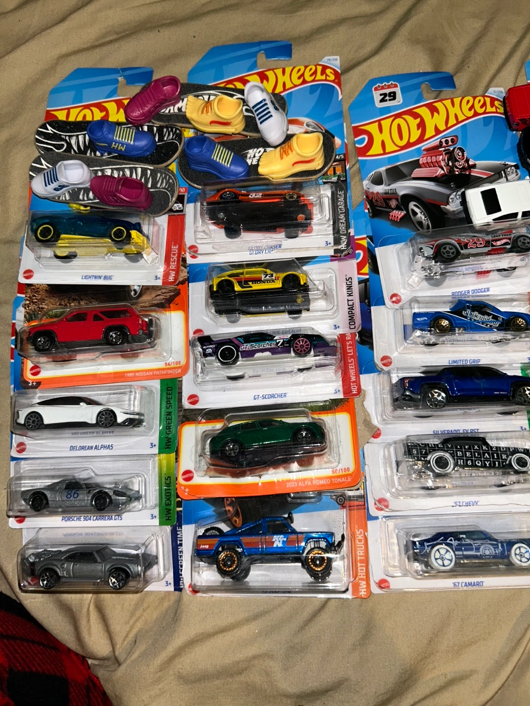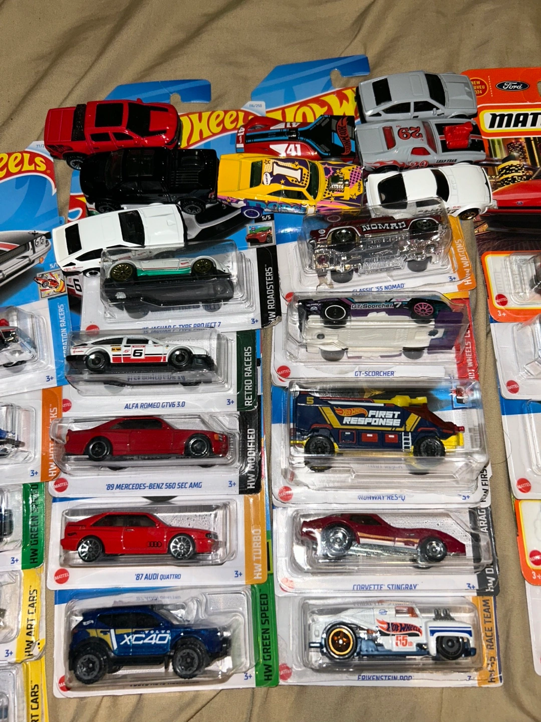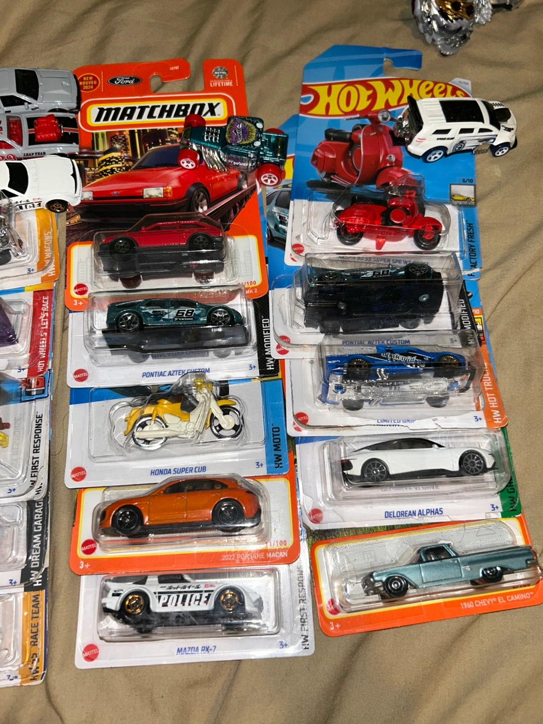 Large collection of Hot Wheels and Matchbox cars. Various models and colours. Many are still in packaging. Great for collectors or kids.