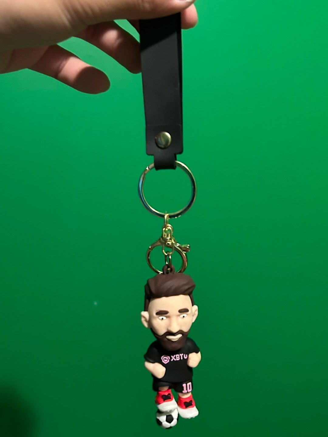 Cute Lionel Messi figurine keychain. Features a black shirt with pink details. Gold coloured keyring and black leather strap. Perfect for any football fan!
