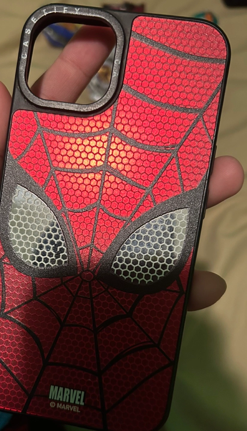 Pre-owned Casetify phone case. Features Spiderman design. Compatible with iPhone 12 and 13 models. Black and red colour scheme. Unique geometric pattern on the back.