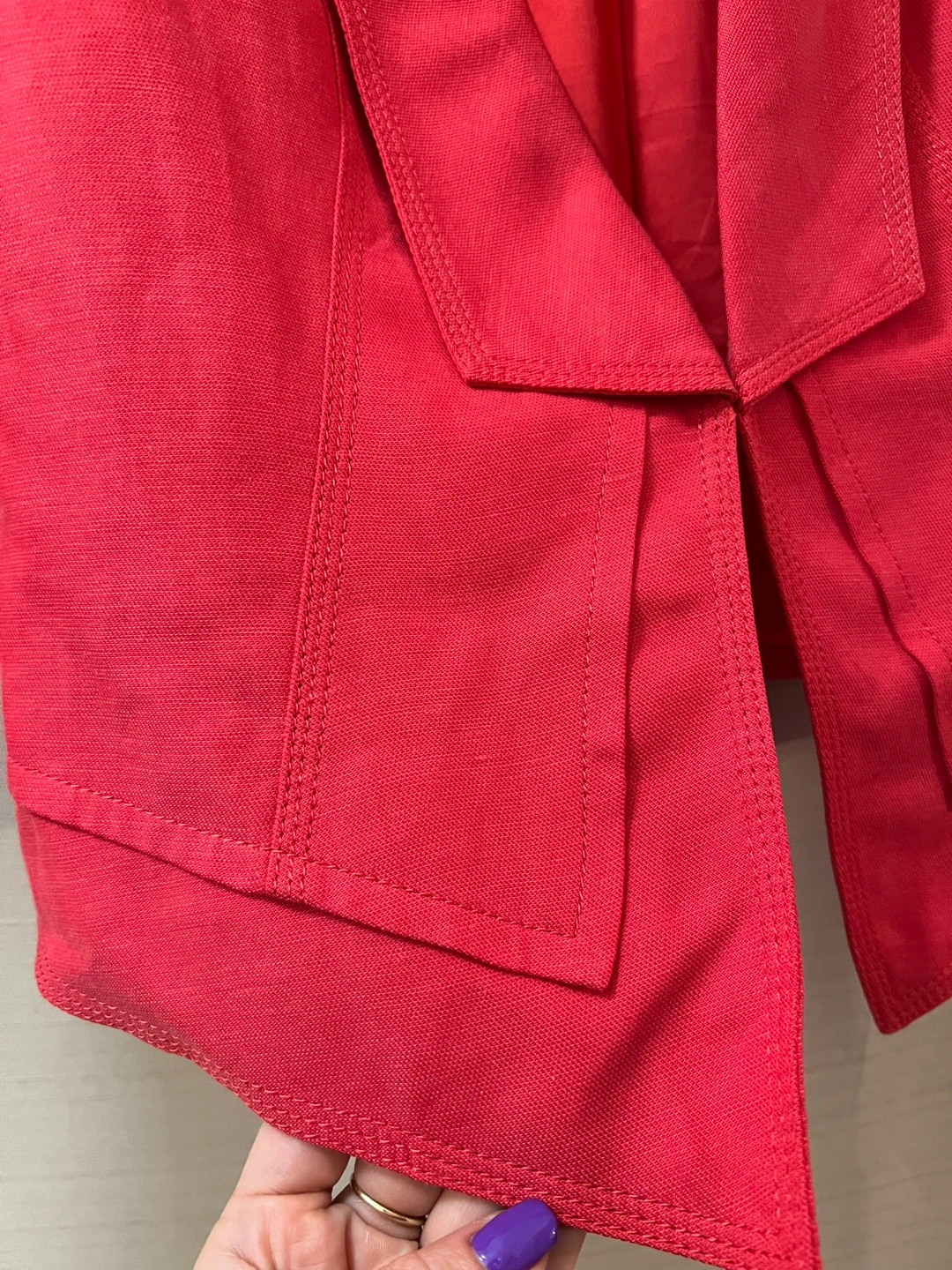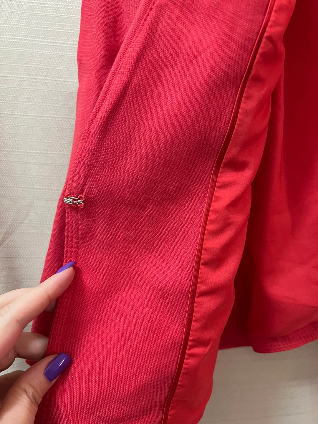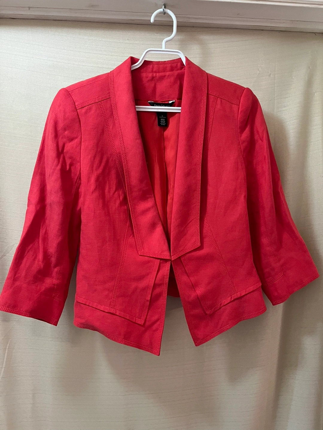 Cropped red blazer. Size 6. Three-quarter sleeves. Open front, can be fastened with a hook! Ptp- 19 Length- 19.5 Arm- 18