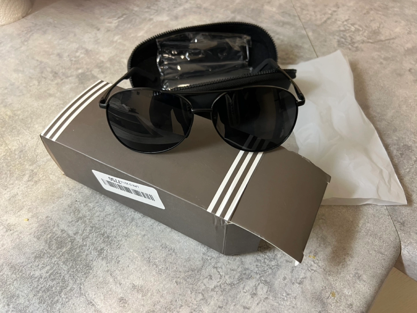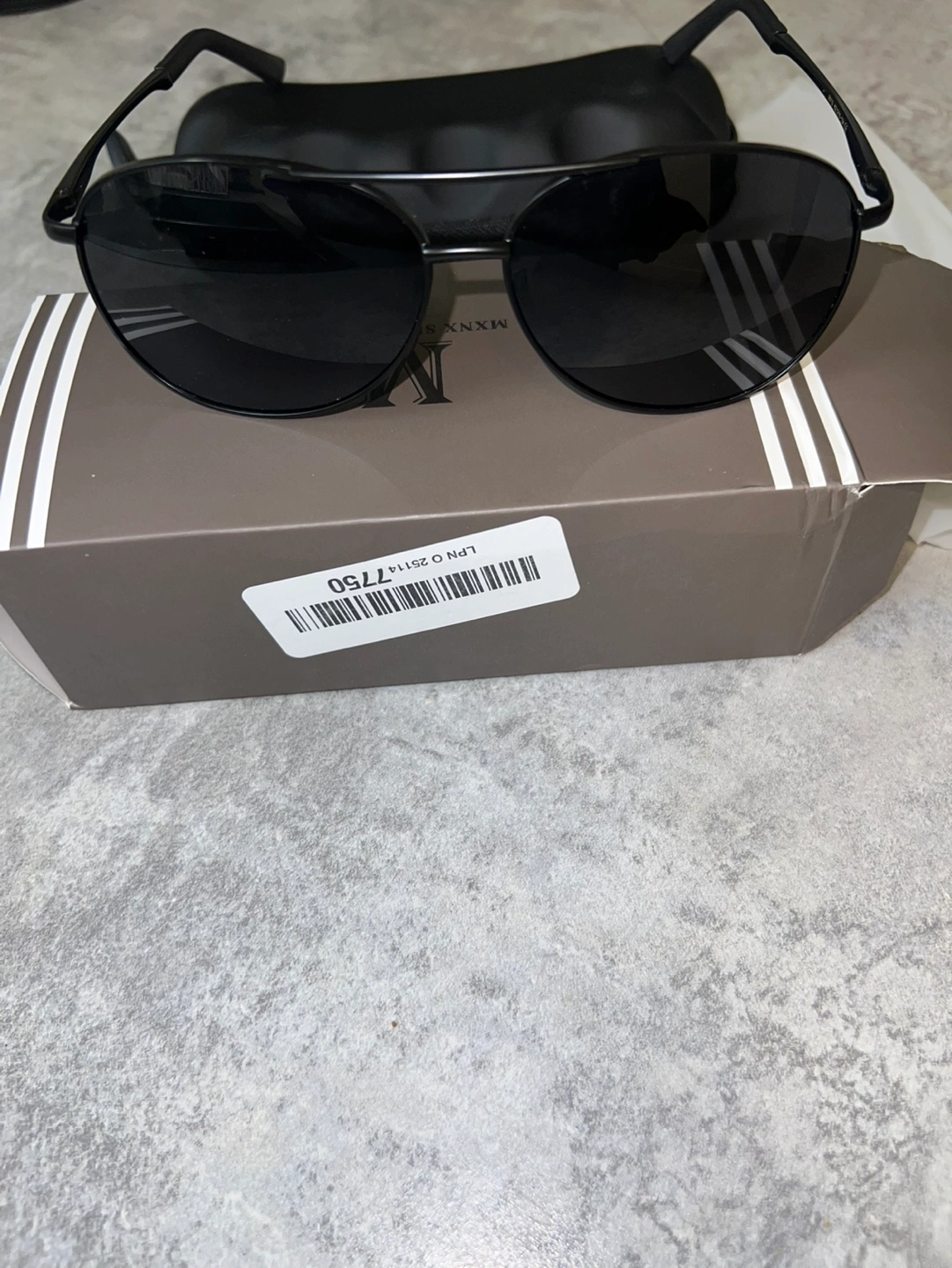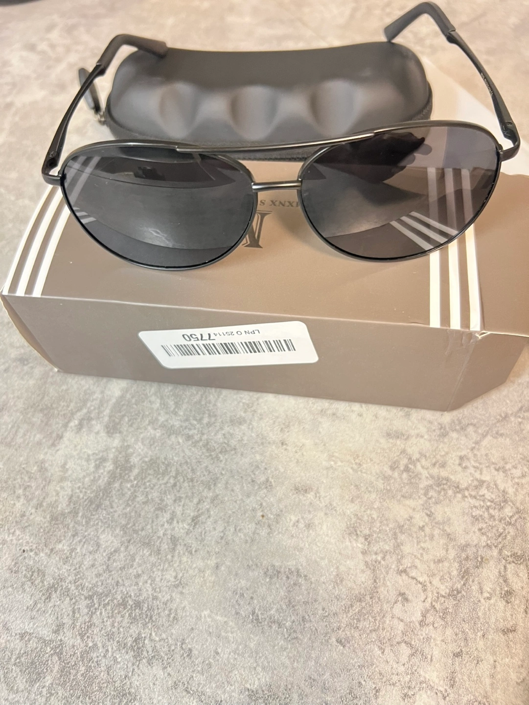 Classic aviator style sunglasses. Black frame, dark grey lenses. Includes protective case and cleaning cloth. New, never worn.