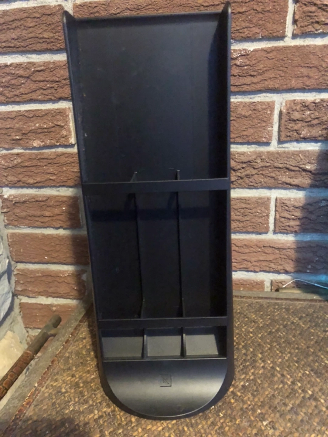 Black plastic organizer for Nespresso Original Line Capsule Sleeves. Fits 6 sleeves (3 per side), and dispenses capsules from the bottom. Rotates. This is a very useful but discontinued item! Asking $25.