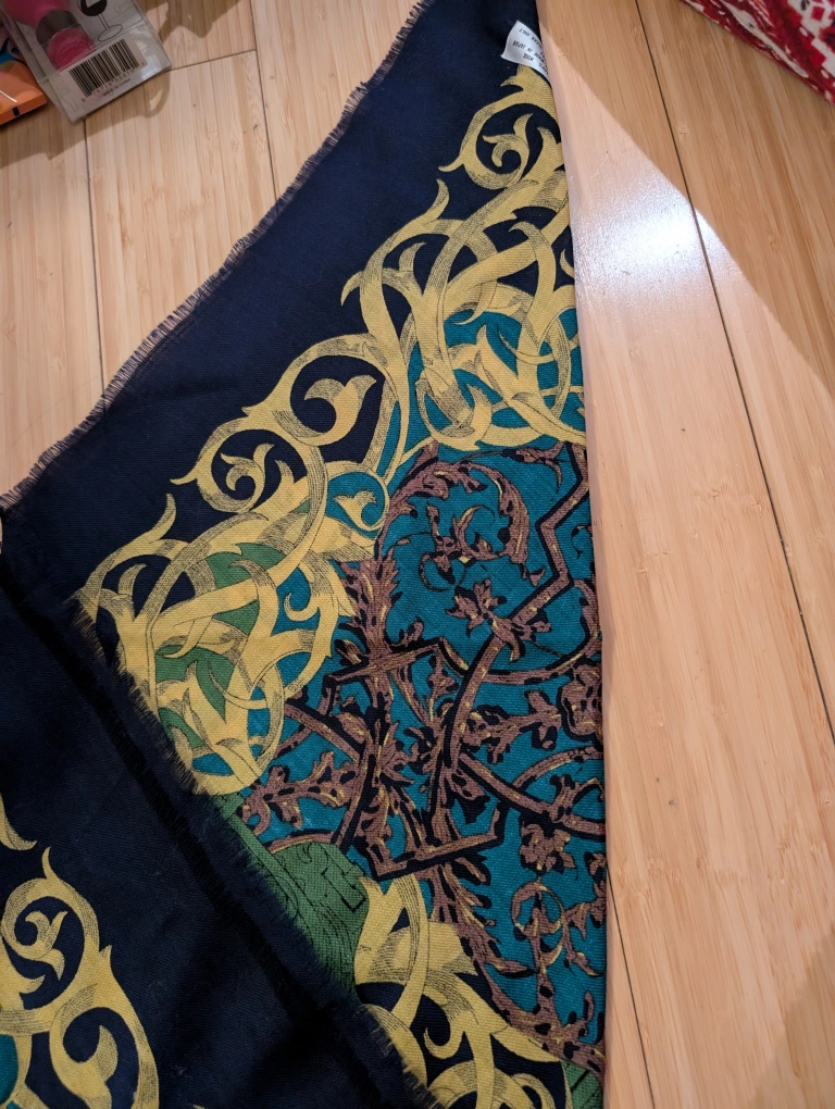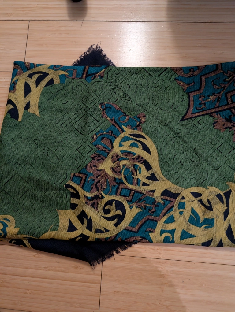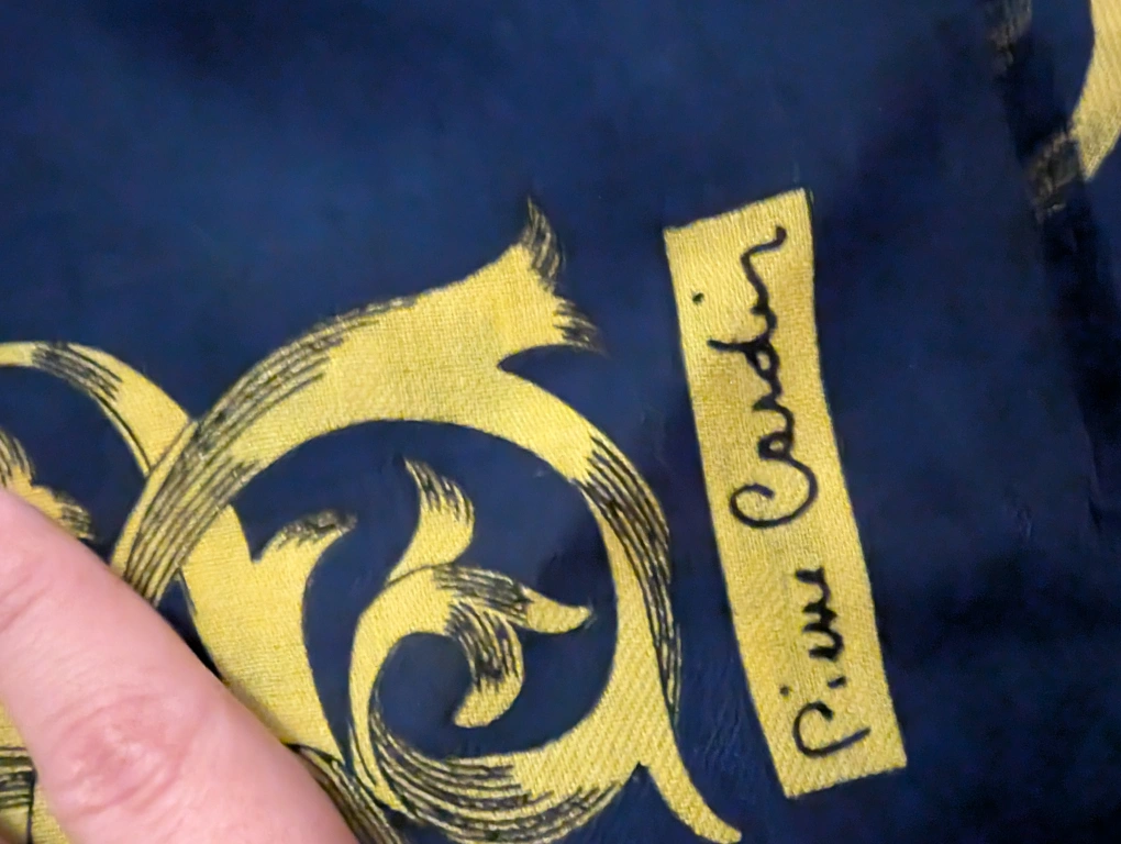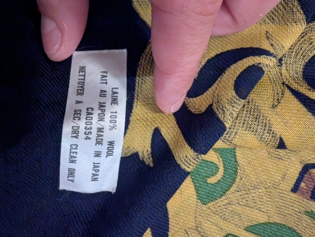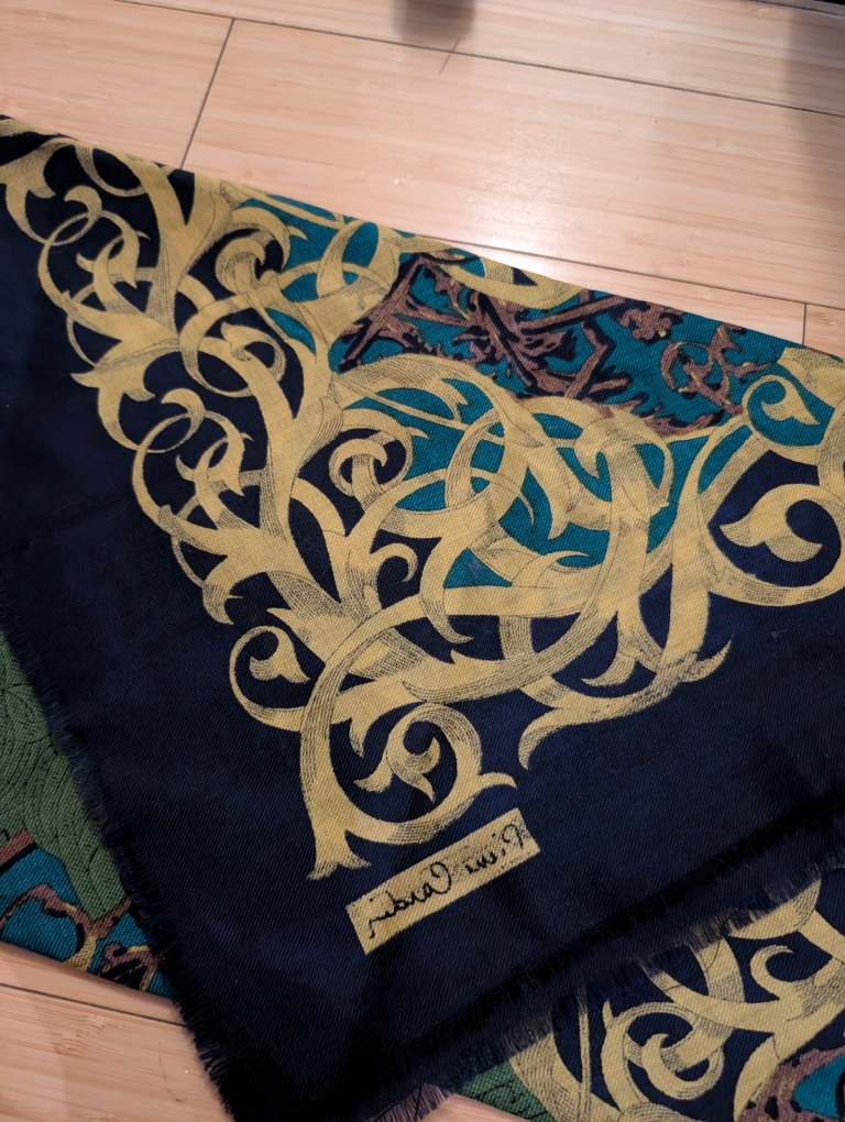Beautiful Pierre Cardin scarf. Features a dark background with gold and teal accents. Made in Japan. 100% wool. Dry clean only.