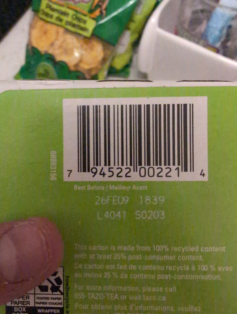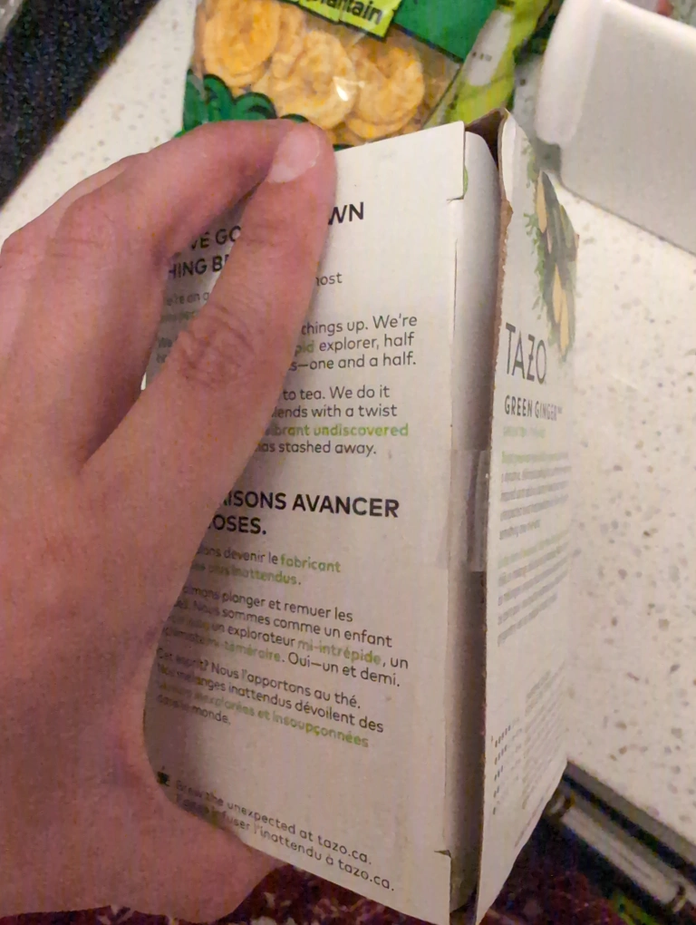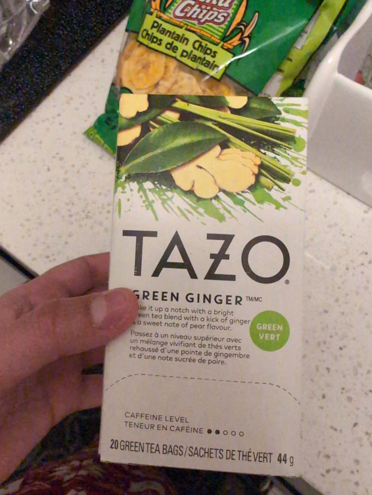 20 tea bags. Green tea blend with ginger and pear. Caffeine level: low. Never opened. Xmas gift, cannot consume because I am allergic to ginger