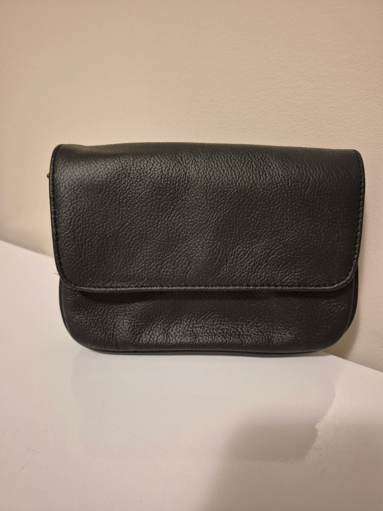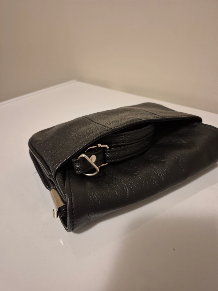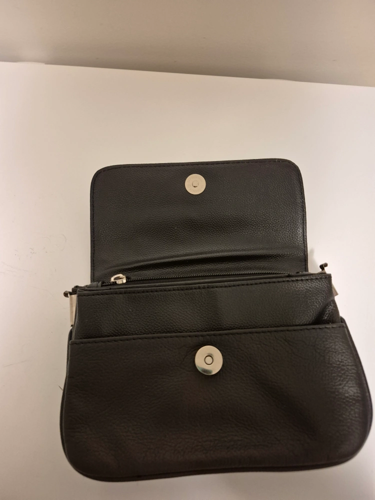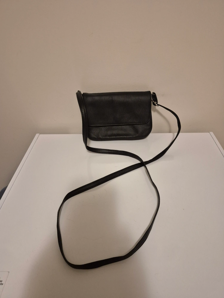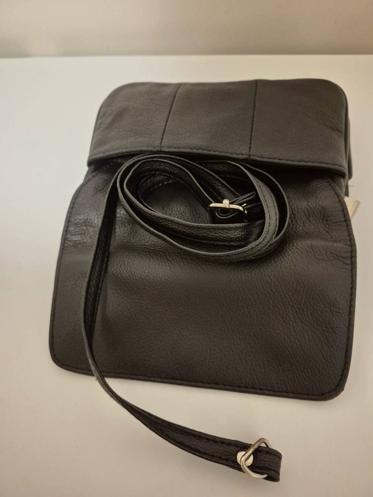 Small black leather crossbody bag. Features a flap closure, adjustable strap, and multiple compartments. Zipper closure and snap closure. Ideal for everyday use. Curbside Only pickup M-Sat 4:30pm-10pm