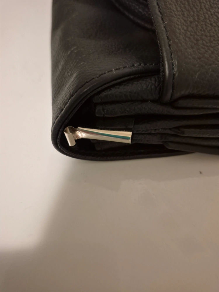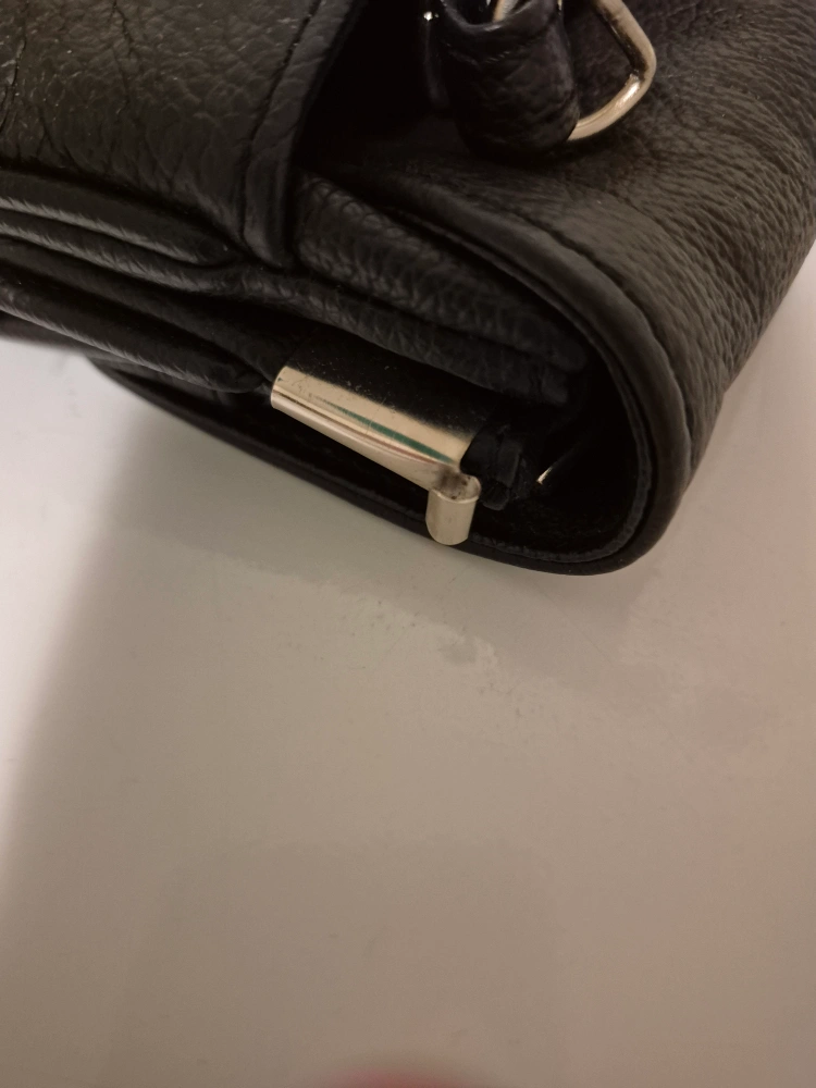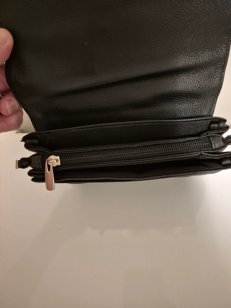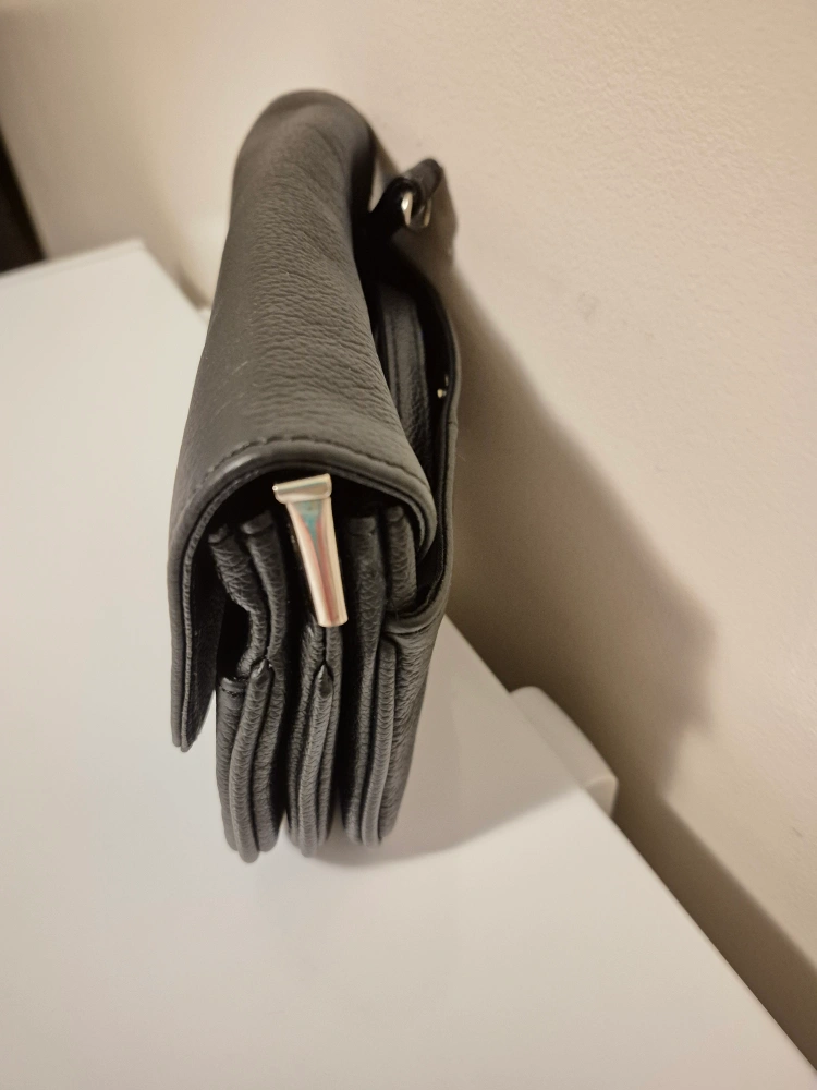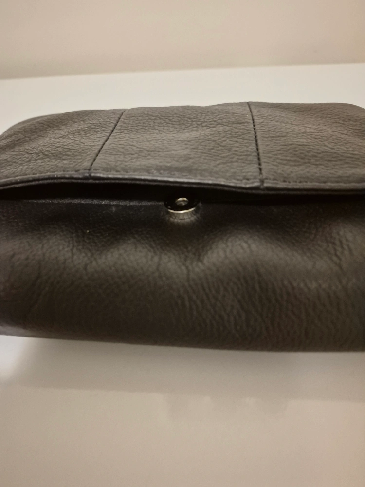 Small black leather crossbody bag. Features a flap closure, adjustable strap, and multiple compartments. Zipper closure and snap closure. Ideal for everyday use. Curbside Only pickup M-Sat 4:30pm-10pm