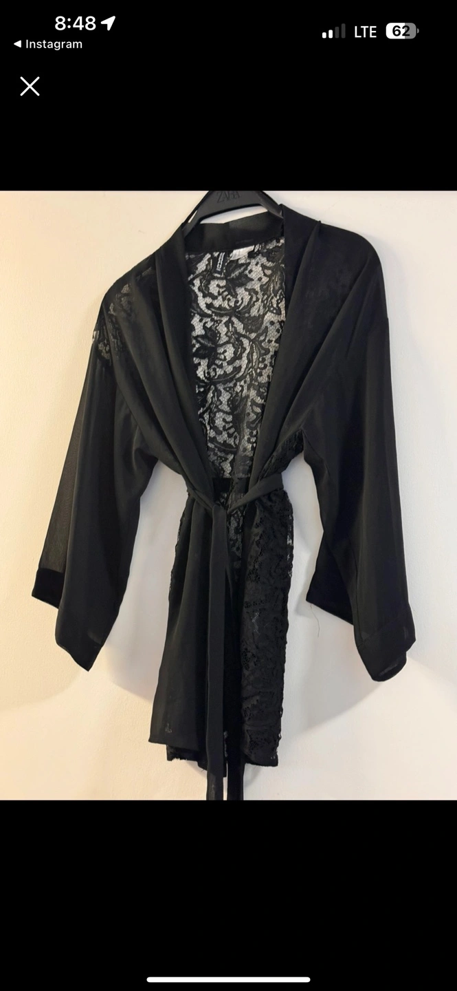 Gorgeous black kimono-style robe. Features delicate lace detailing. Lightweight and flowy fabric. Perfect for layering or lounging.