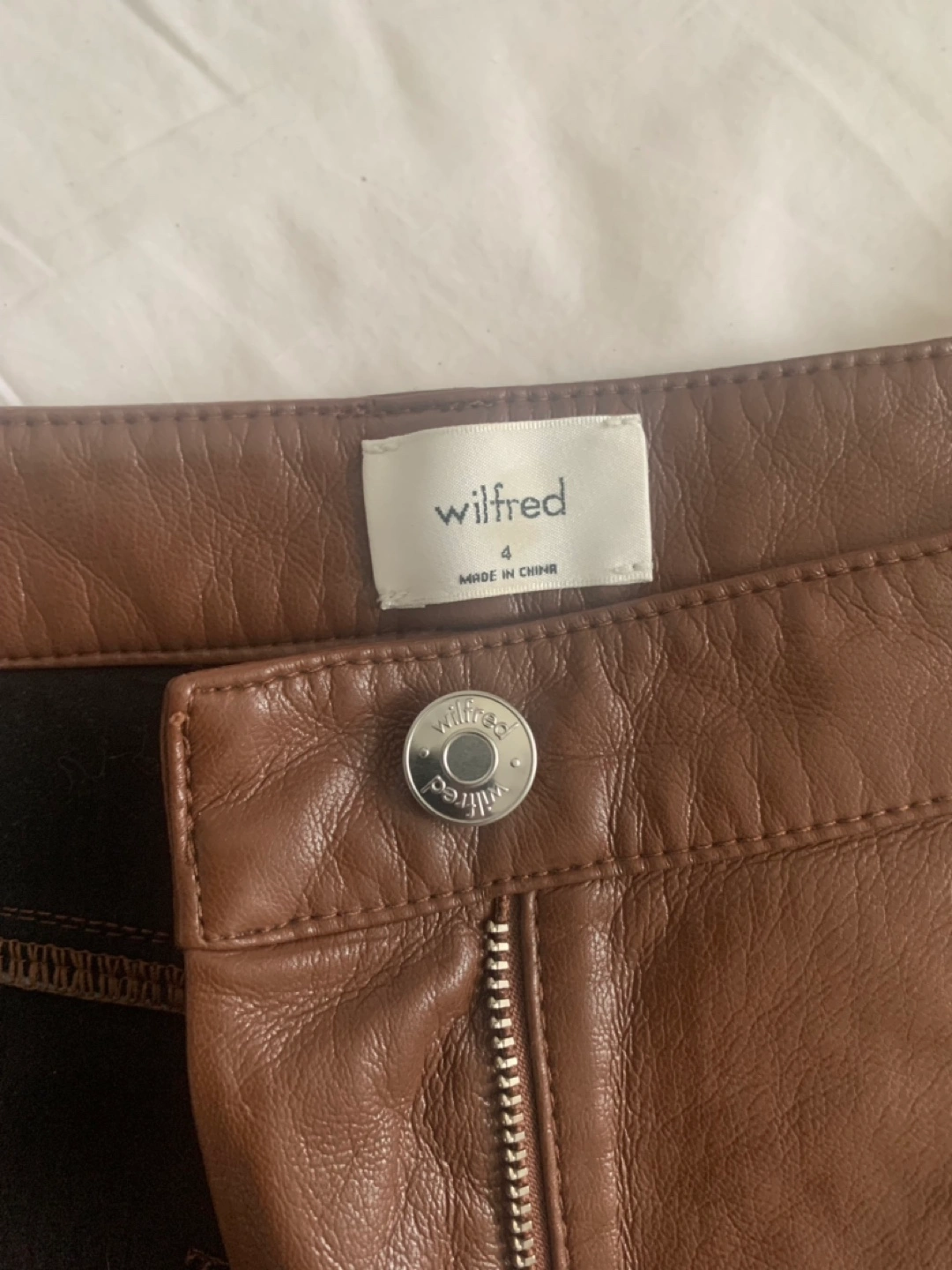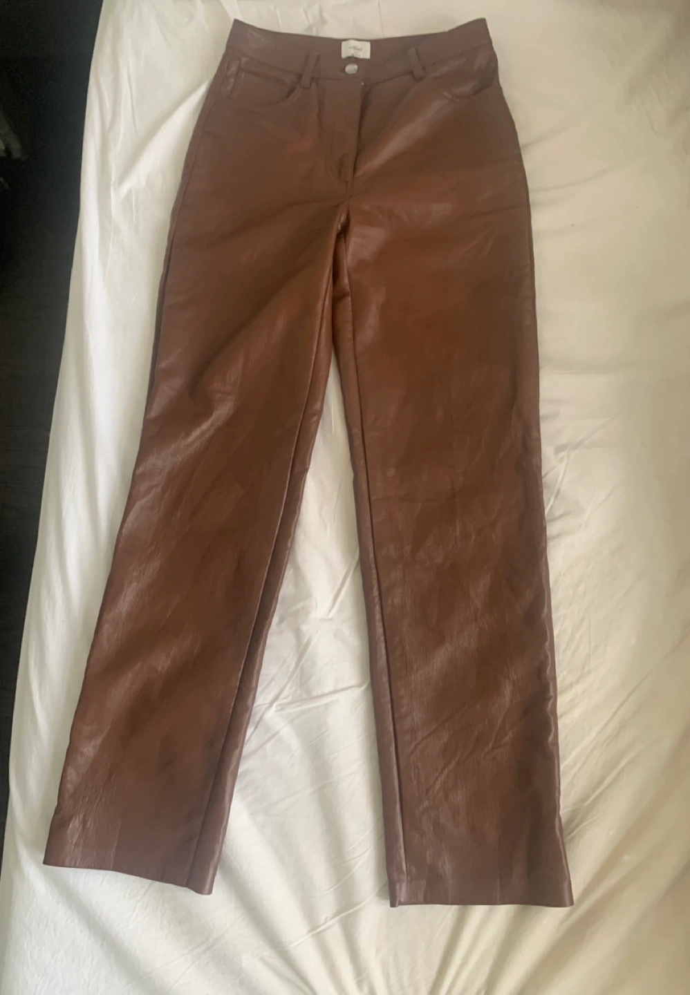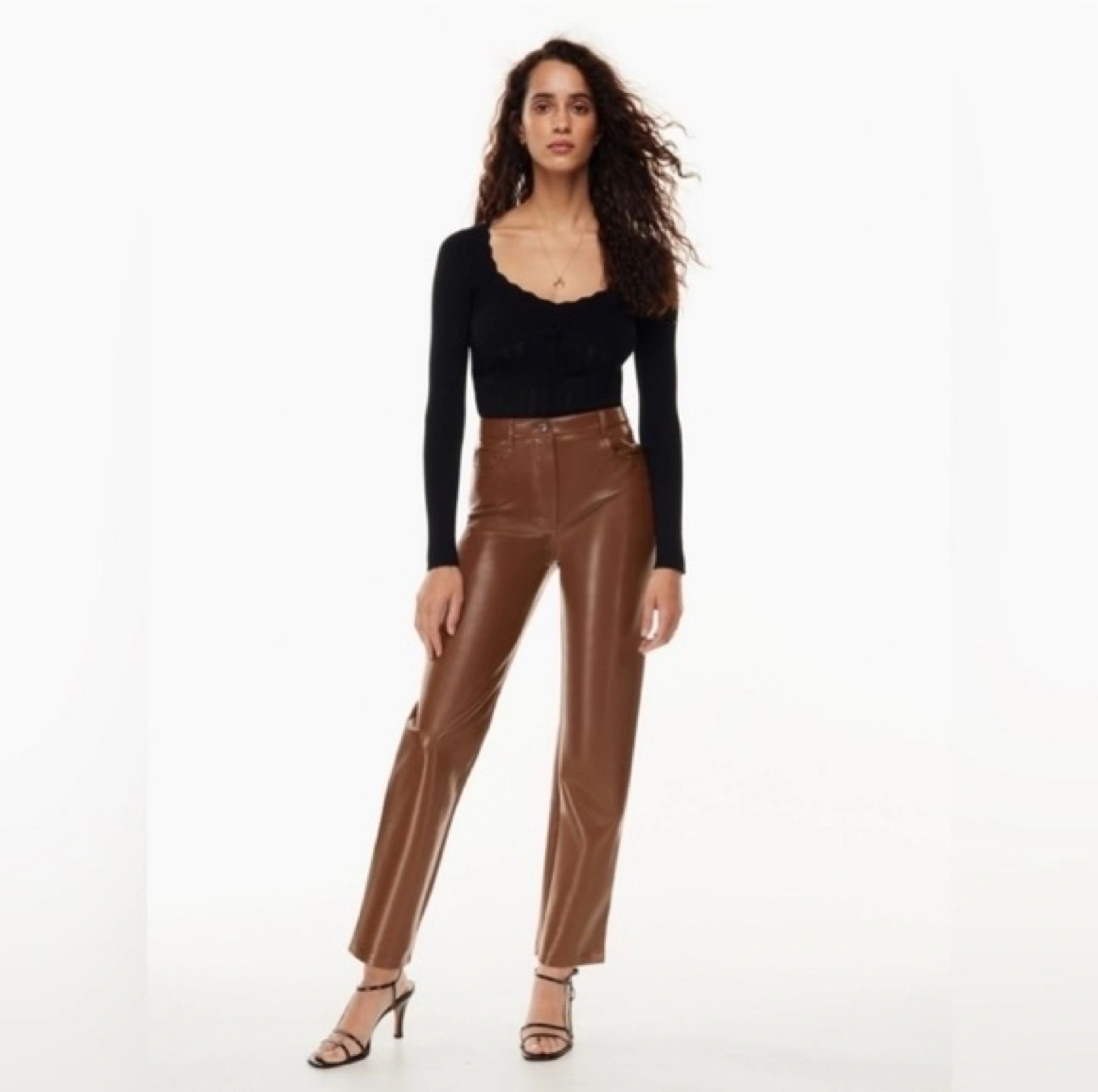 The classic Melina pant from Aritzia / Wilfred in Brown faux leather. Straight leg. Size 4. Need a steam / iron (see all photos) but otherwise in good condition!