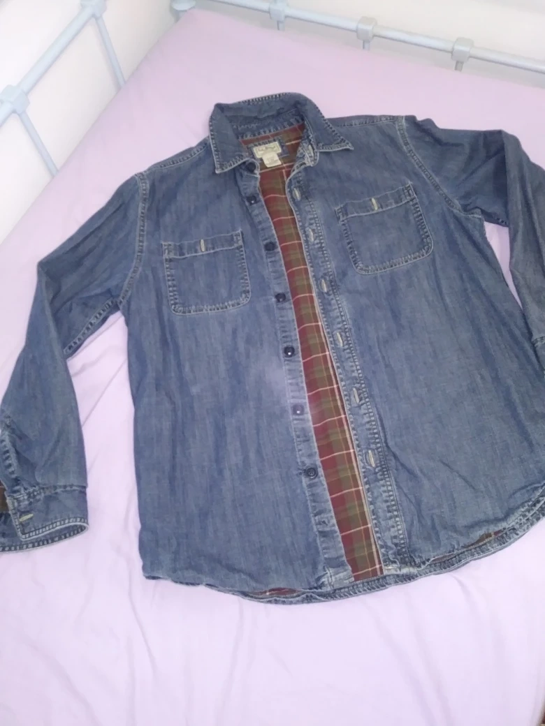 Long sleeve denim shirt. Plaid flannel lining. Two chest pockets. Button closure. 100% cotton.
