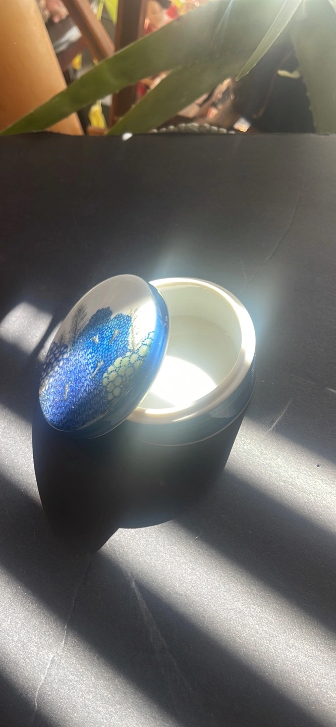 Small round trinket dish. Features a blue and white floral design. Lidded container. Perfect for jewellery or other small items.