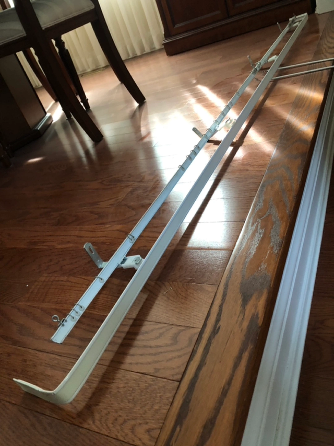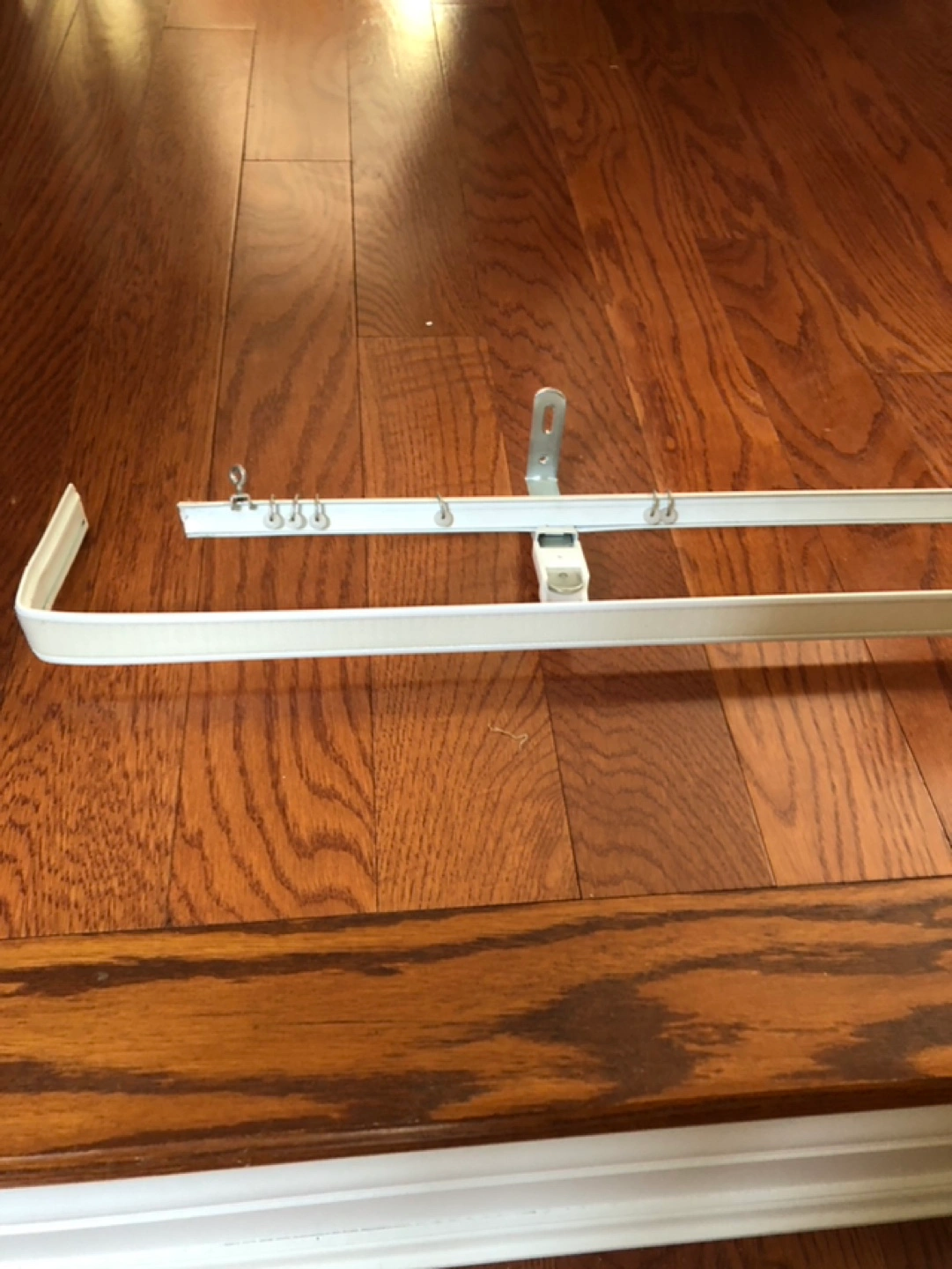 Double track curtain rod. White metal. Includes hardware. Good condition.