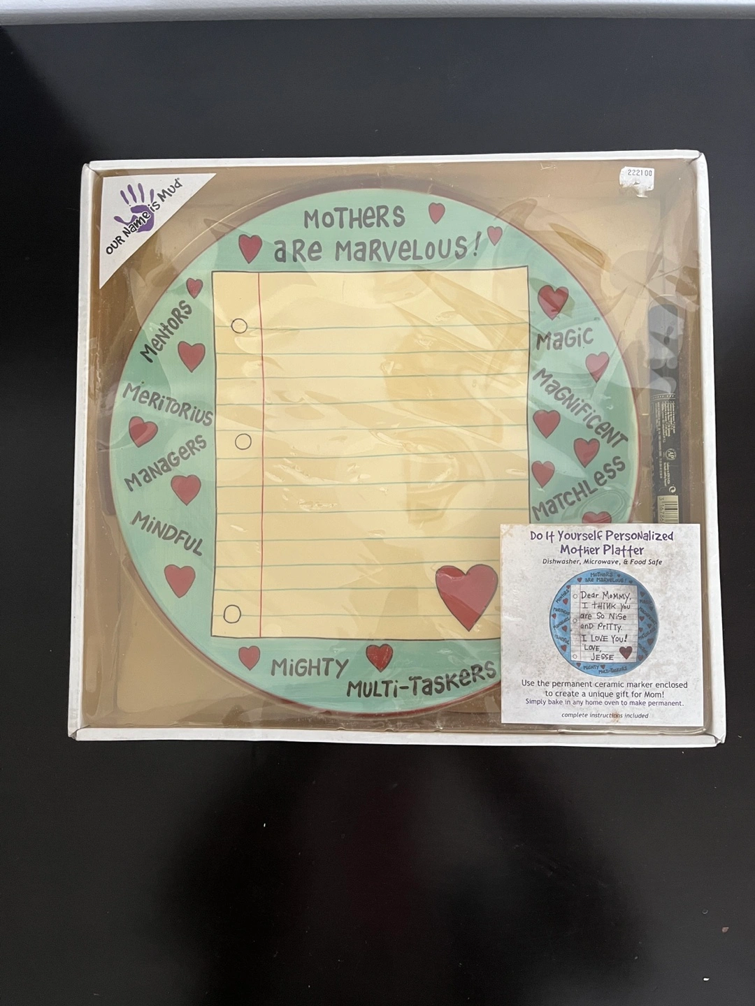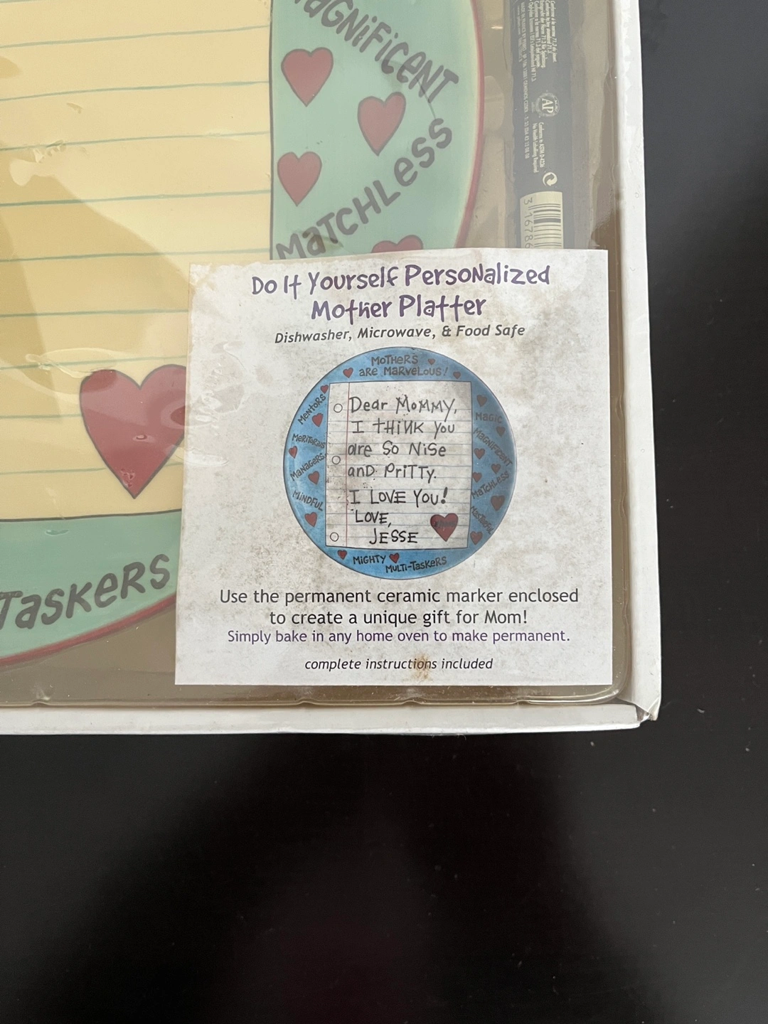 New in box. Ceramic platter. Features space to personalize. Includes permanent marker. Dishwasher, microwave, and food safe.