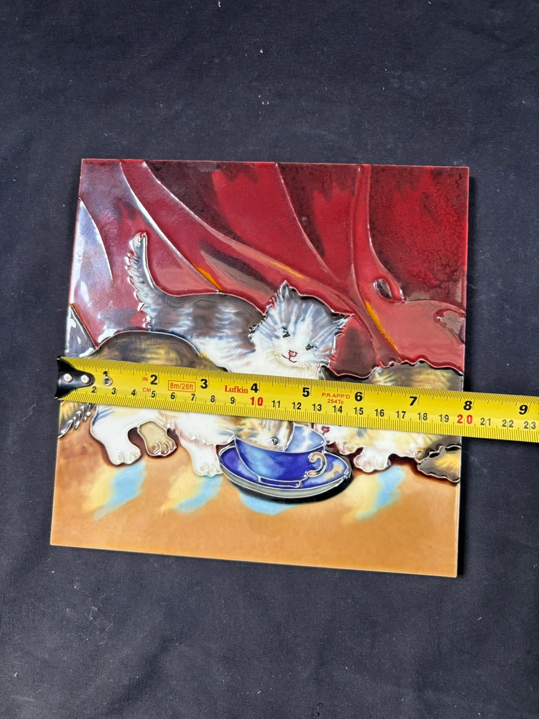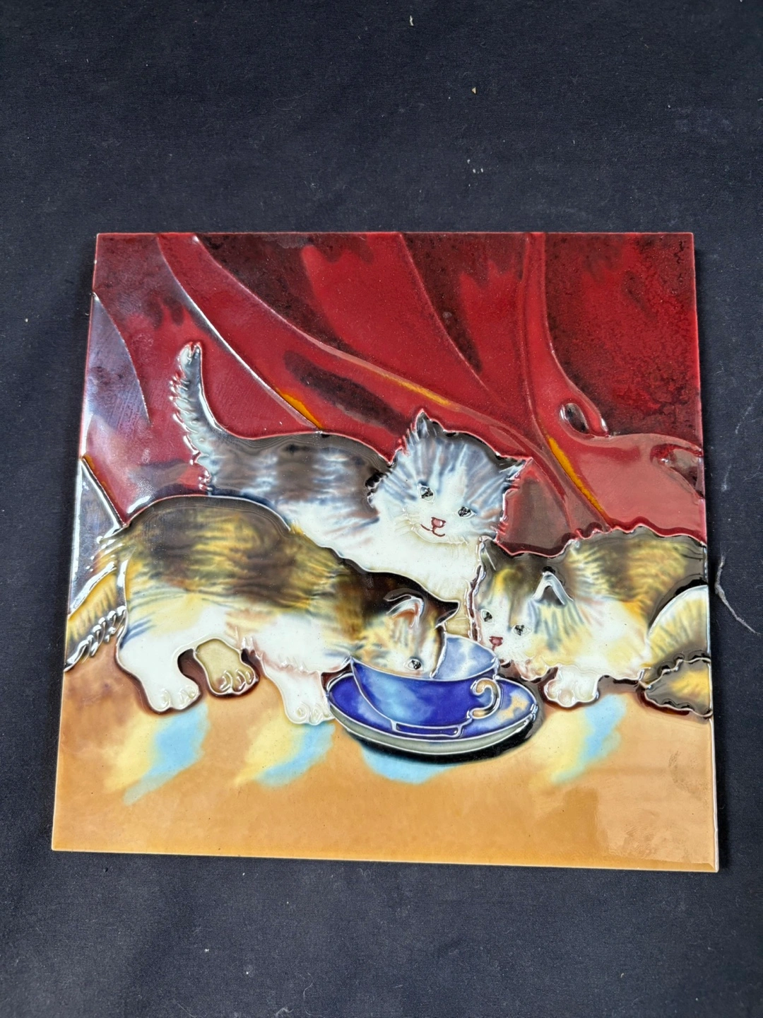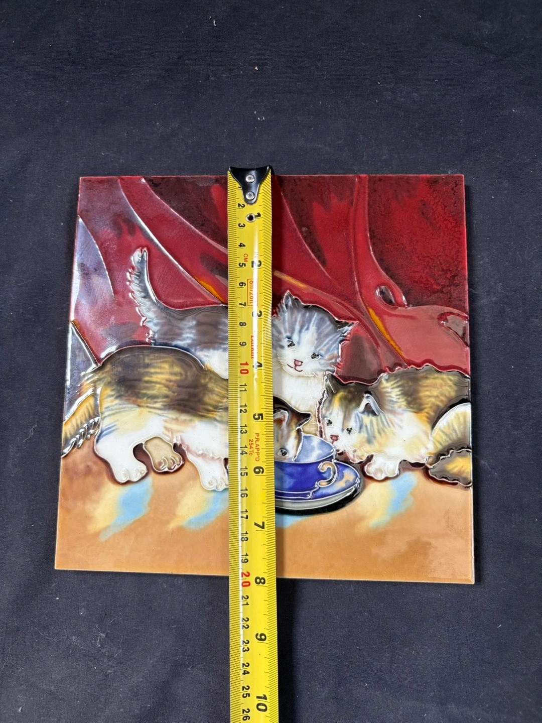 good condition Vintage Kitten Ceramic Tile Hand-painted ceramic tile featuring three kittens around a teacup. Measures approximately 8x8 inches. Unique design, perfect for collectors or home décor. Comes with a simple backing for wall hanging.$1 Pick up Victoria Park and O’Connor area