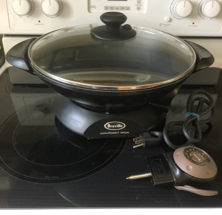 Breville brand electric wok. Features a glass lid and temperature control. Includes power cord and separate temperature controller.