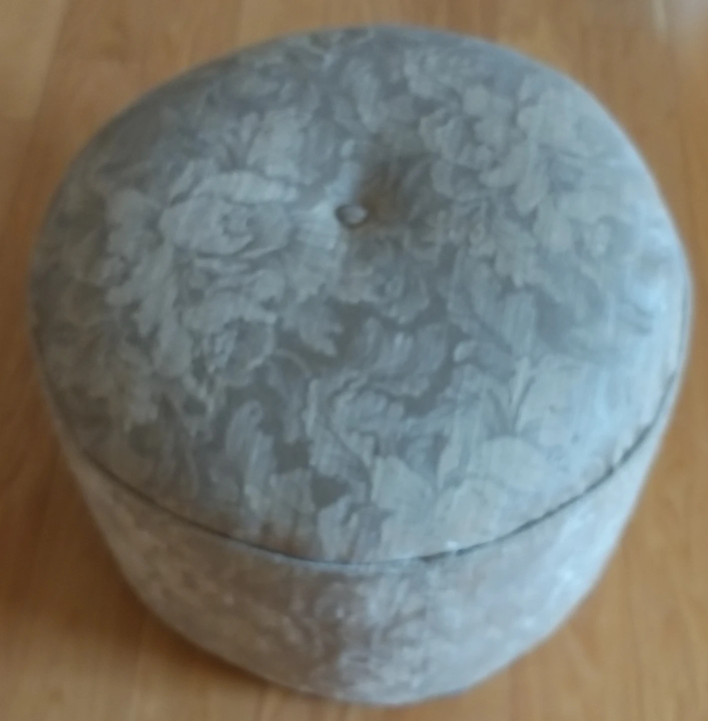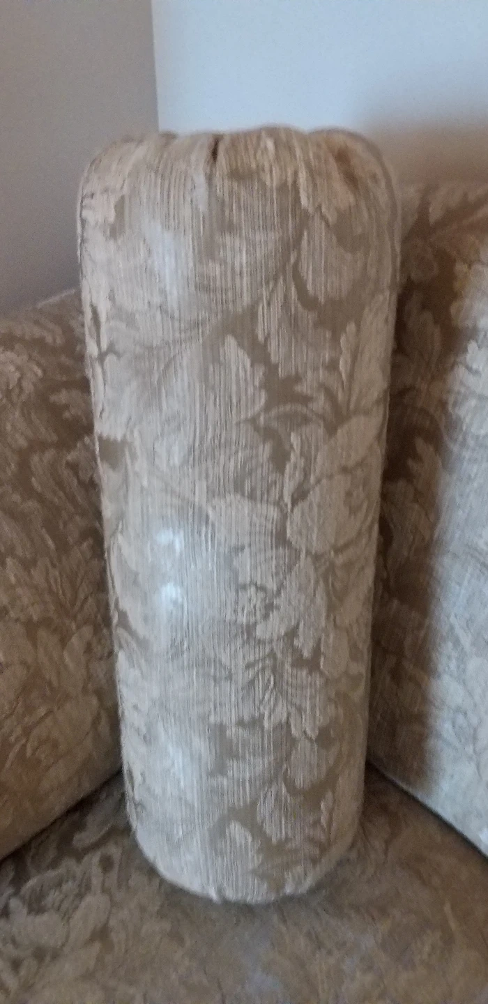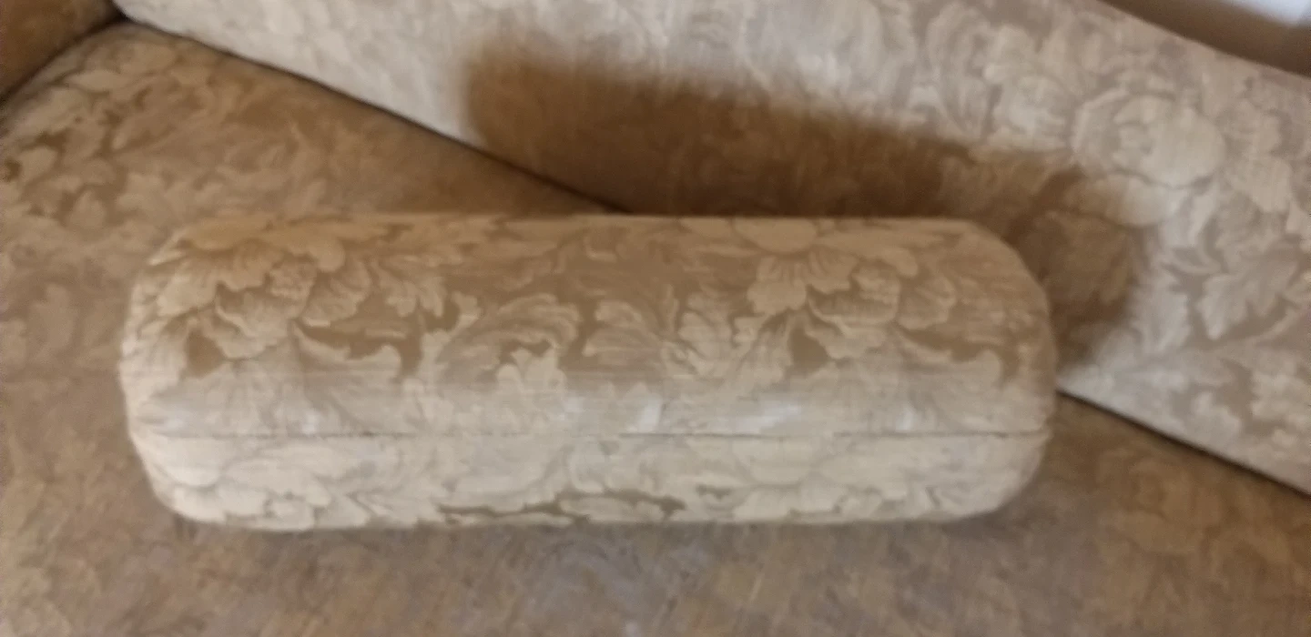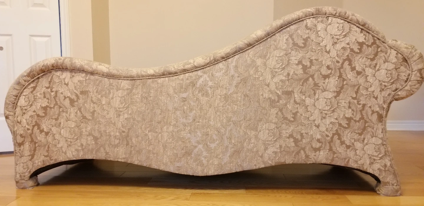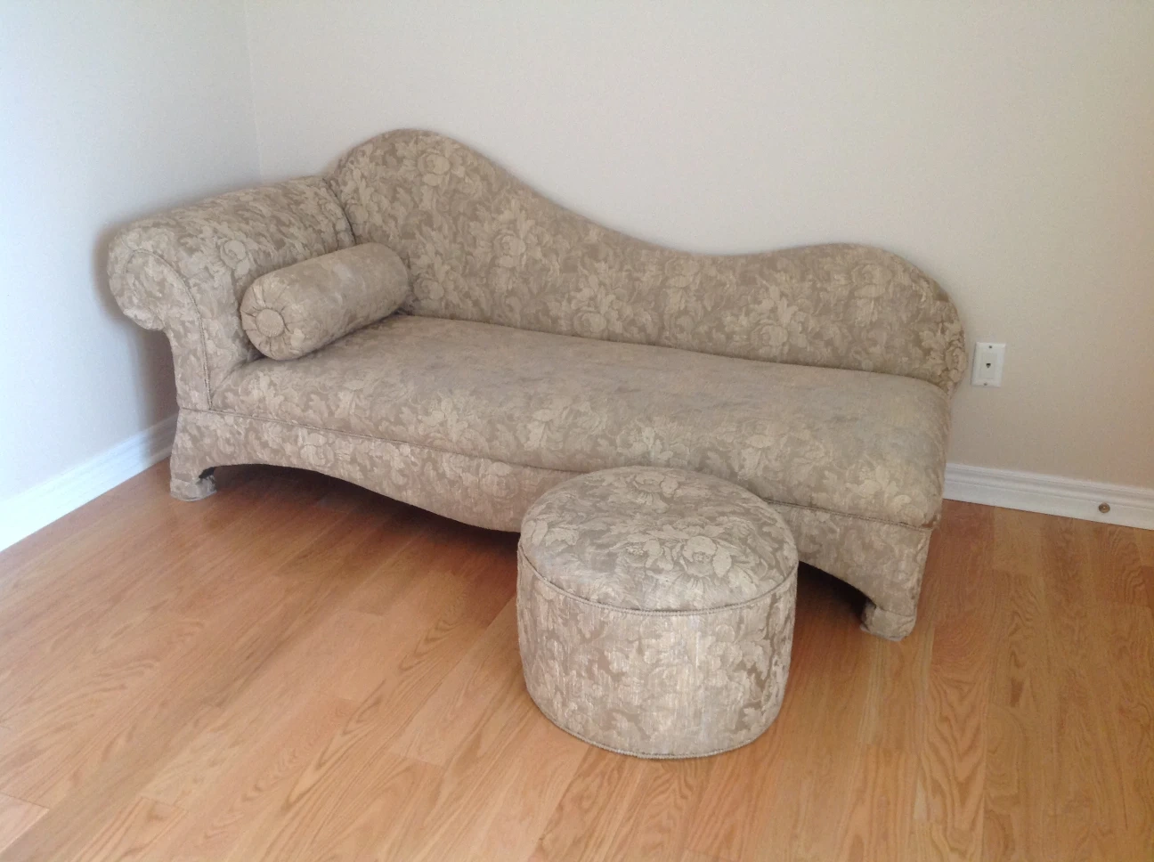 Elegant chaise lounge and ottoman set. Beige fabric upholstery features a floral pattern. Perfect for a bedroom or living room. Size: 75"L x 30"D x 27" (Arm side) 33"R side, 26"L side