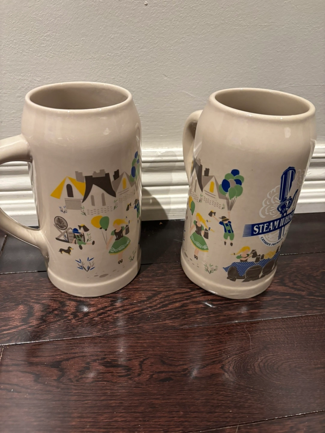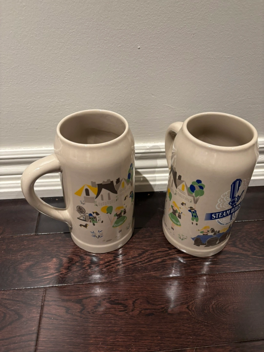 4 vintage beer steins. Cream-coloured ceramic. Features colourful illustrations. Great for collectors. $15 for the set of 4, no cracks or chips Pickup in Richmond Hill I sell vintage/used pieces. As a buyer of vintage or used objects you should assume a baseline of mild wear. If you expect normal minor wear you will be happy with your purchase.