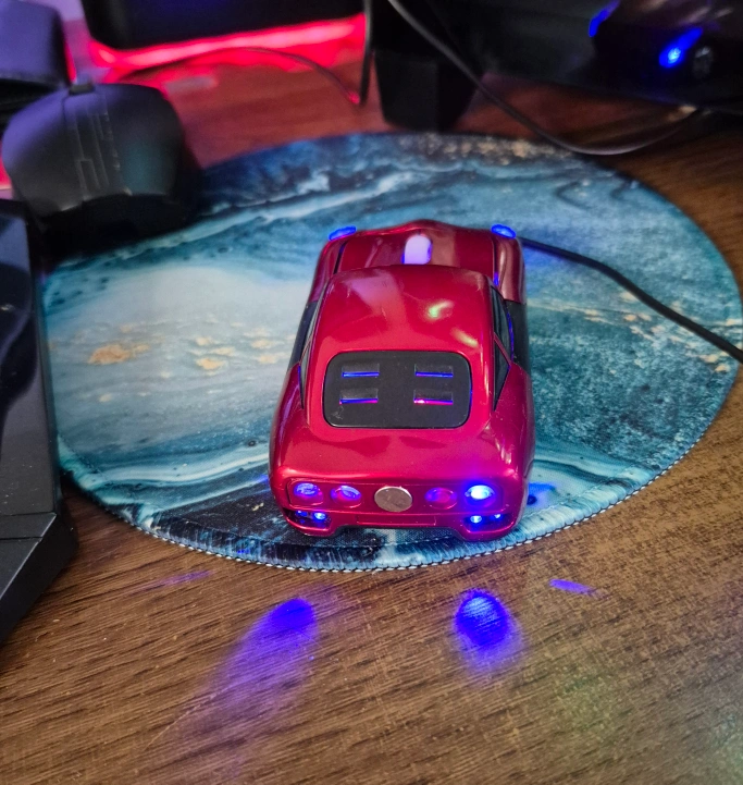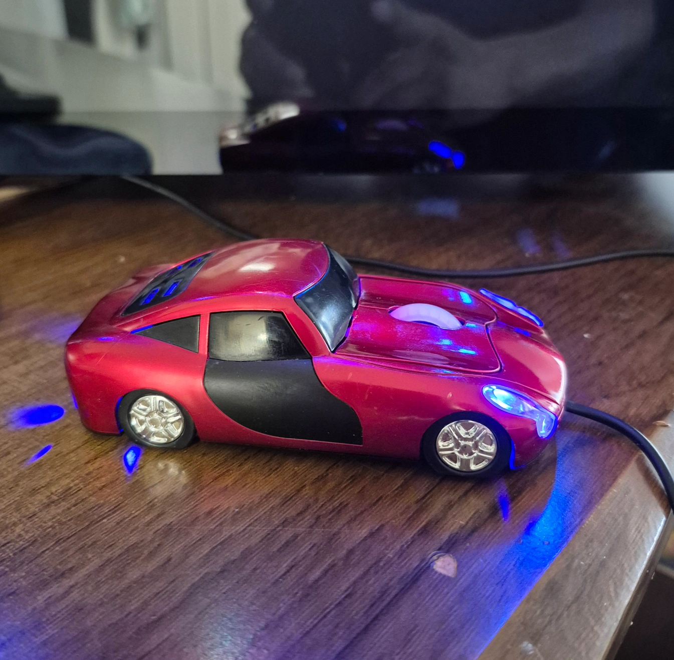 Wired computer mouse. Red car design. Features blue LED lights. Looks great on any desk. pick up only and cash