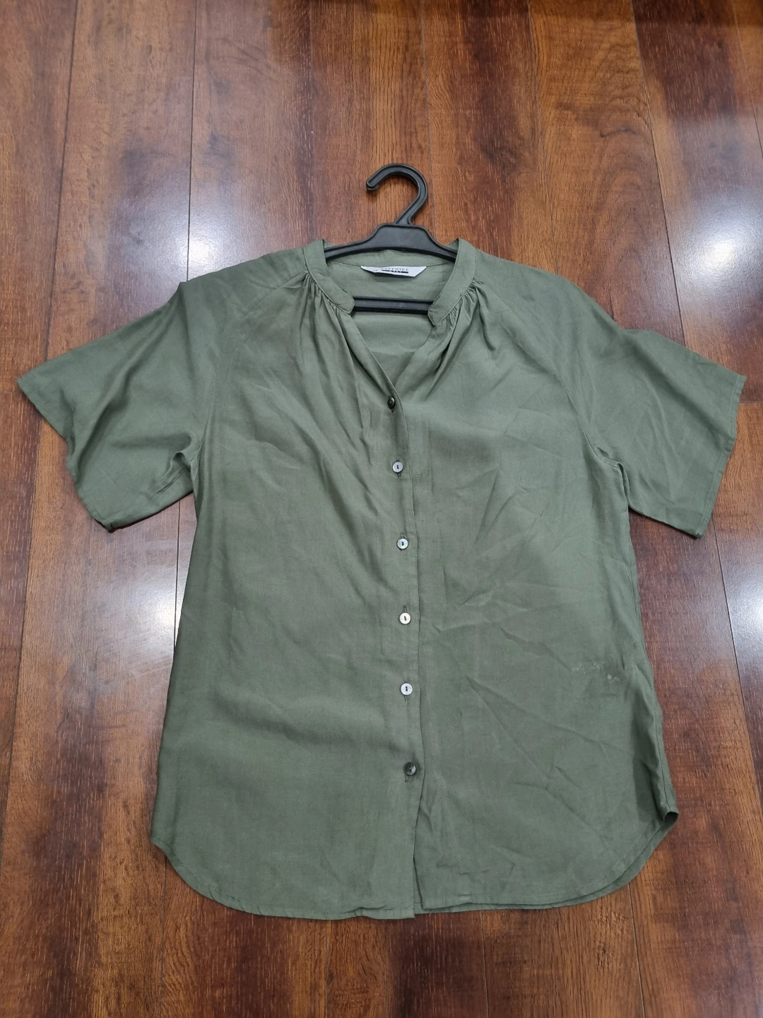 Women's olive green short sleeve button-up blouse. Cute relaxed fit. Button front closure with a round neck. Pls bring your own bag to carry item π