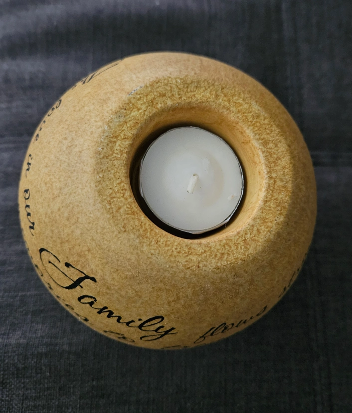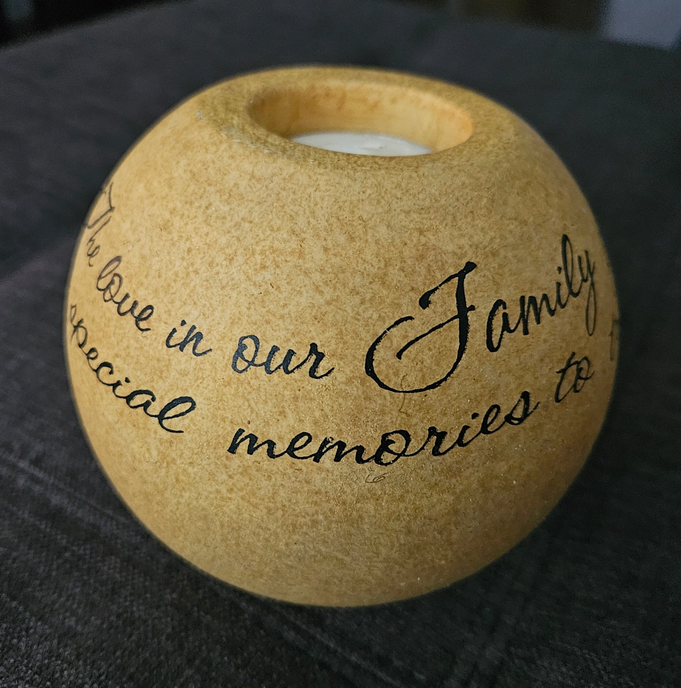 Round ceramic tea light holder. Has a phrase engraved on the side saying "The love in our Family flows strong and deep...leaving us special memories to treasure and keep." Includes a tea light candle. King St W and Dufferin St area. See my other listings.