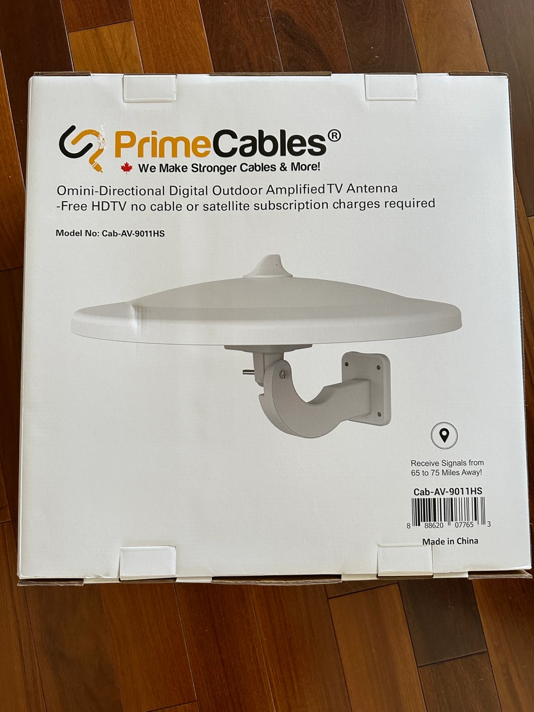 Outdoor amplified HDTV antenna. Model No: Cab-AV9011HS. Receives signals from up to 75 miles away. Features omni-directional reception, VHF/FM enhanced version, and more. Includes antenna unit, AC/DC adapter, power insert with smart switch, and coaxial cable. Box size 49*49cm Brand new .