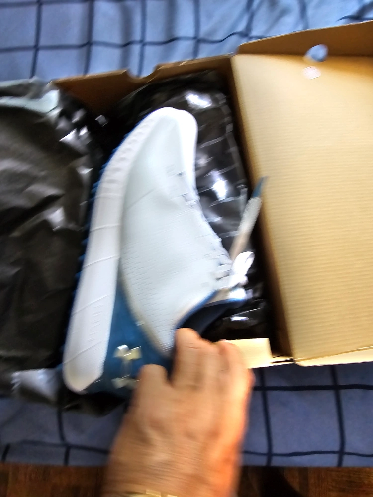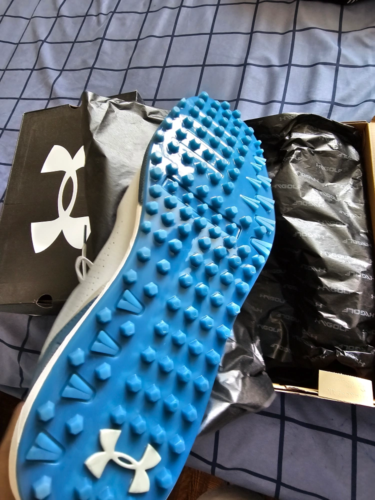 Men's golf shoes. Size 9.5 UK, 43 EUR, 27.5 CM. White and blue colourway. Spiked sole. New in box.