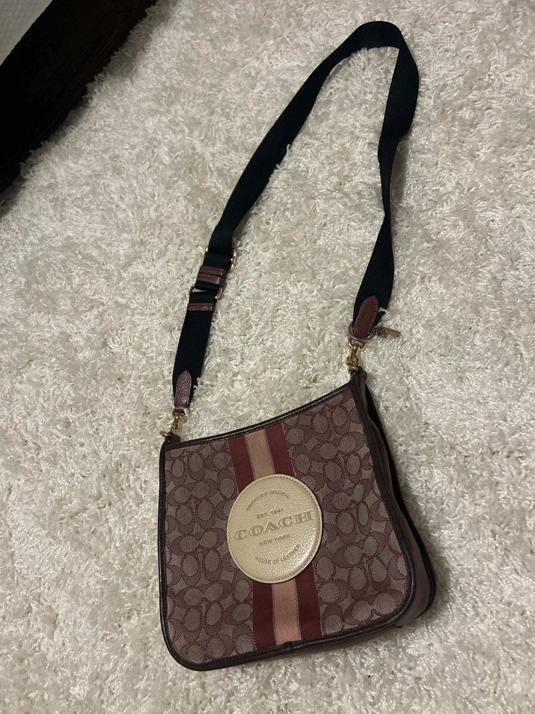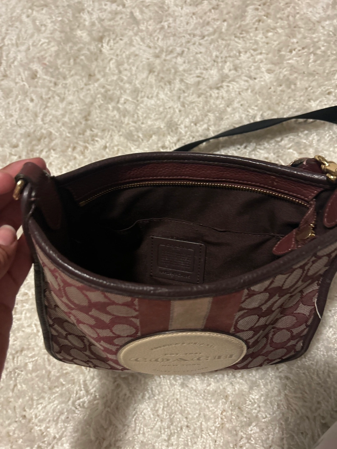 Maroon crossbody bag. Adjustable strap. Coach logo. Interior pocket. Zipper closure.