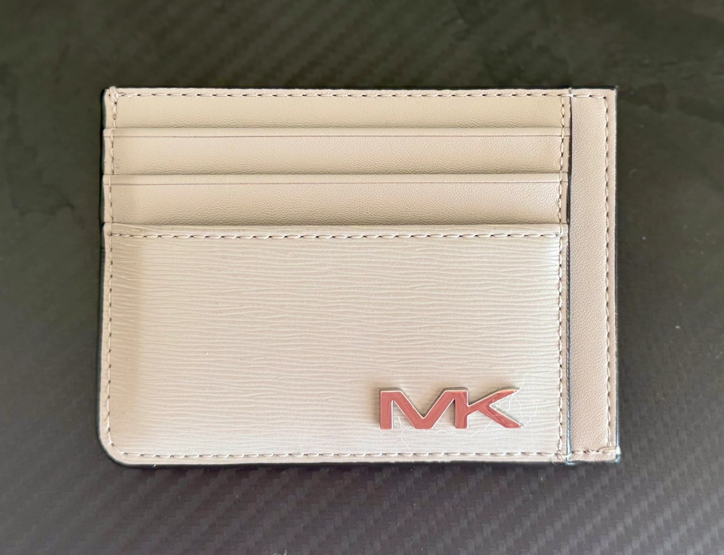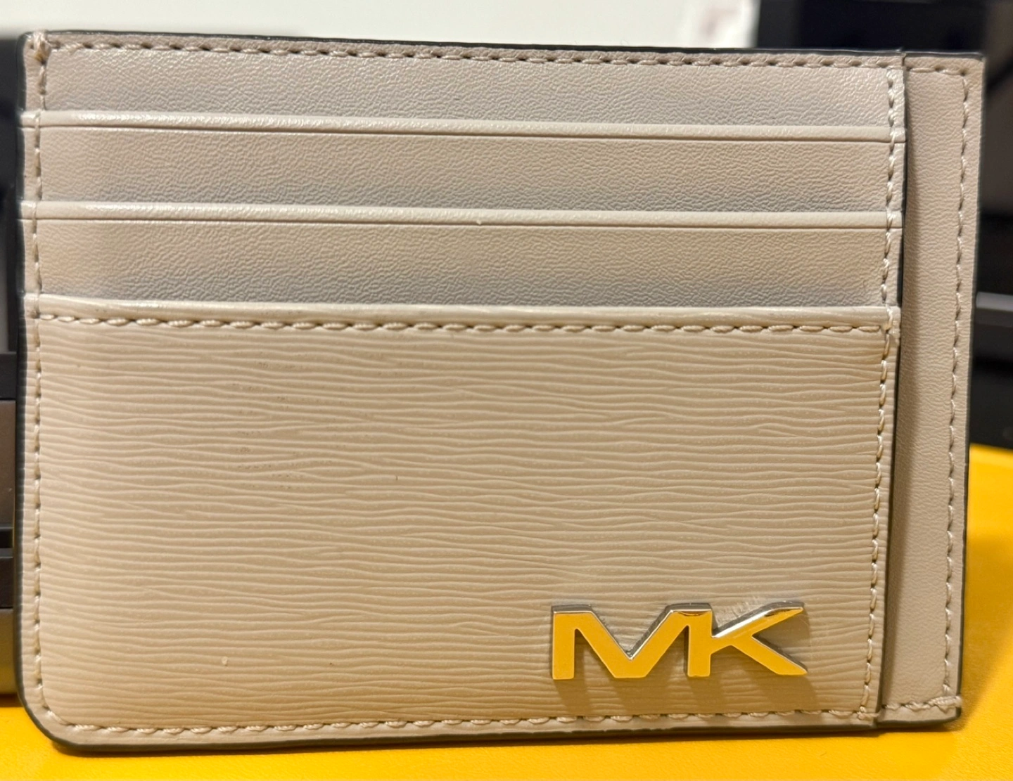Slim leather card holder. Beige colour. Multiple card slots. Gold MK logo. Like new condition. If it’s posted, it’s still available. Cash preferred.