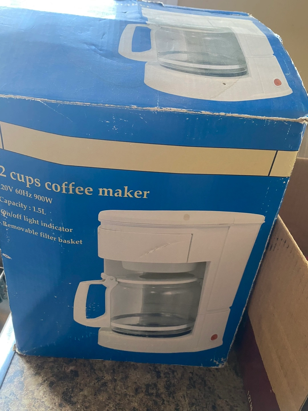 12-cup coffee maker. White. 1.5L capacity. 900W. Removable filter basket. On/off light indicator. Includes instruction booklet.