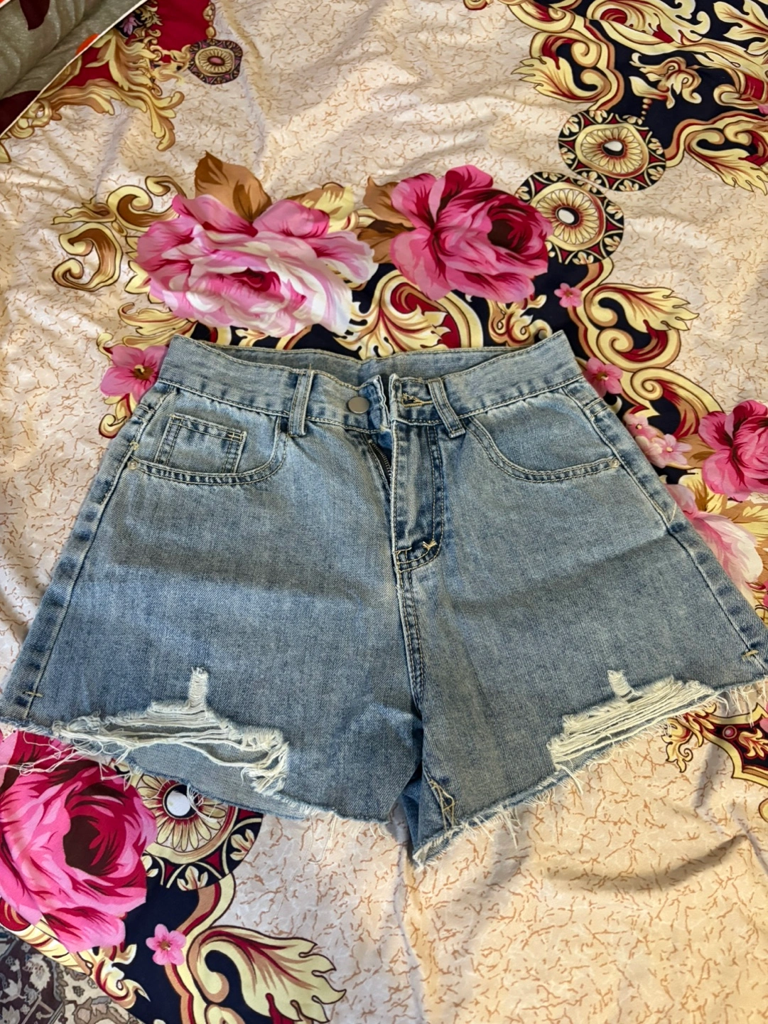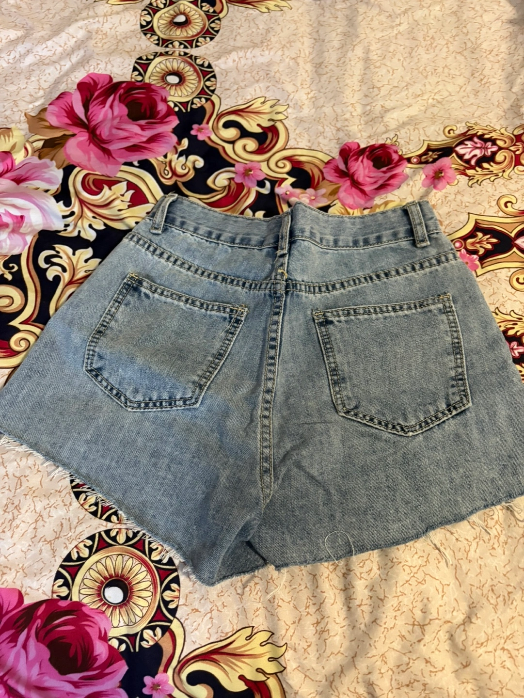 Women's light wash denim shorts. Distressed hems. Five-pocket styling. Button and zipper closure. High-waisted.