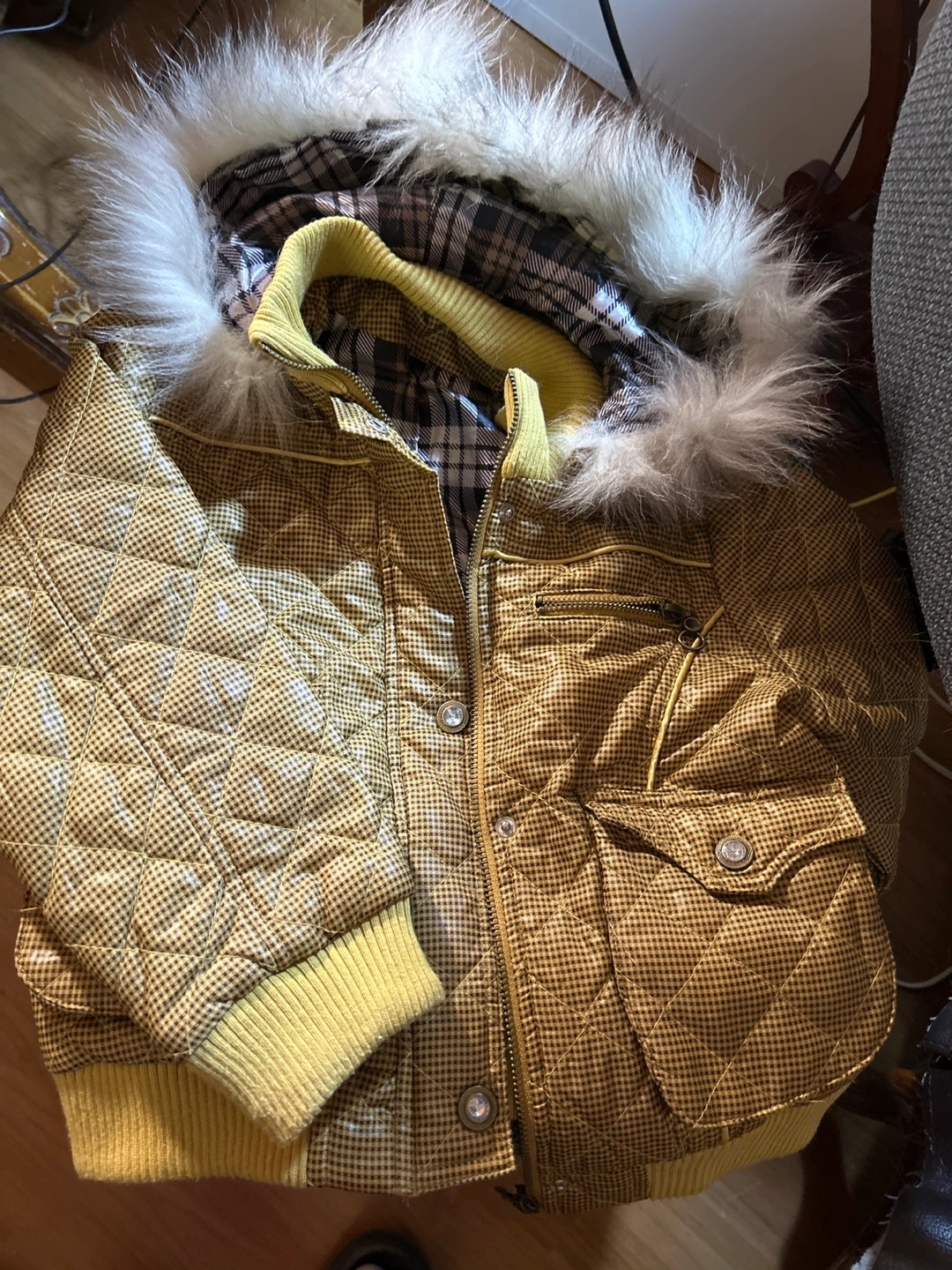 Adorable girls' winter jacket. Yellow quilted exterior. Faux fur trimmed hood. Plaid lining. Great for cold weather. Zipper and snap closure. Ribbed cuffs.