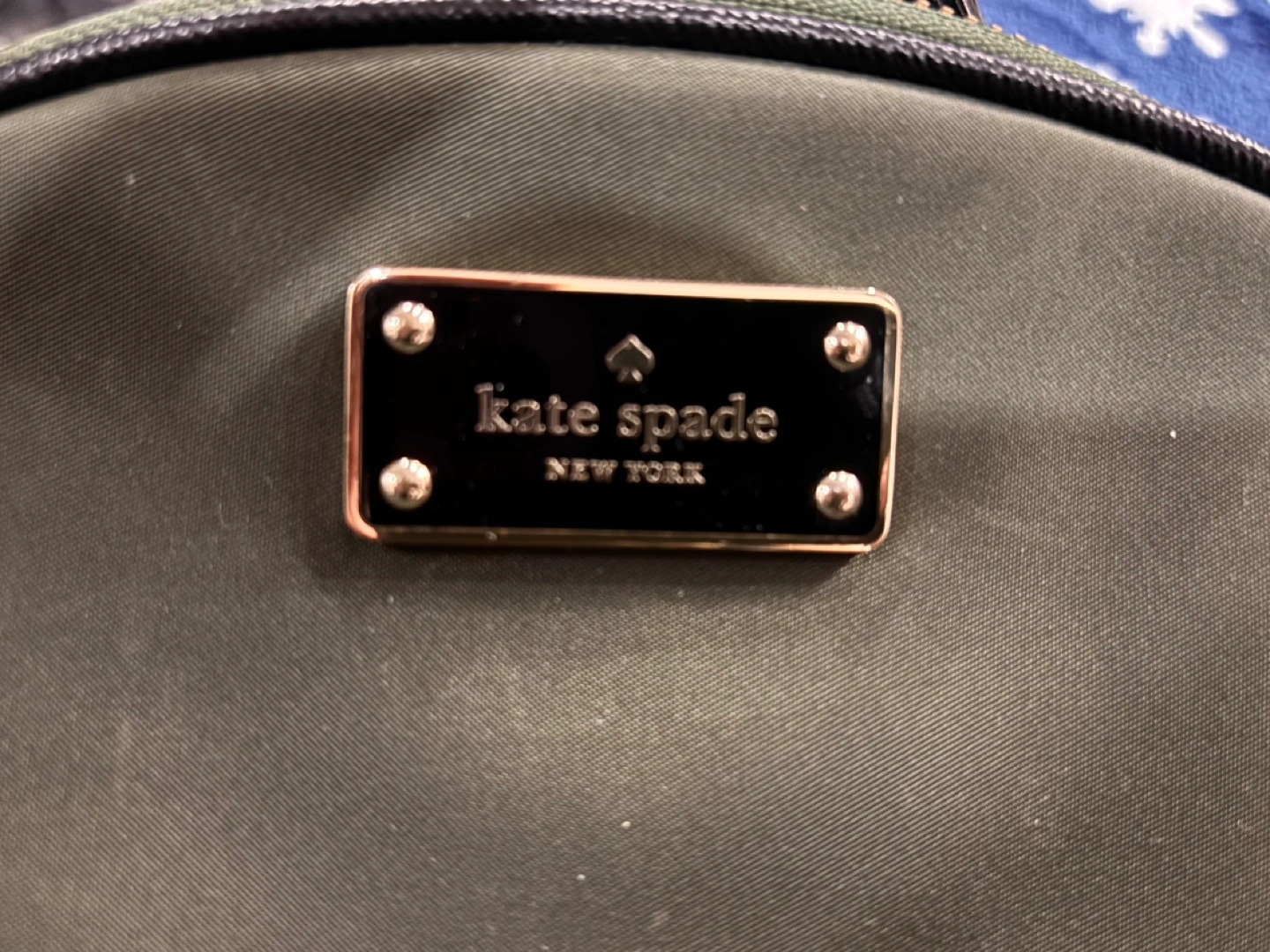 Small backpack, olive green colour. Gold zippers and hardware. Black accents. Interior lining features Kate Spade New York branding.
