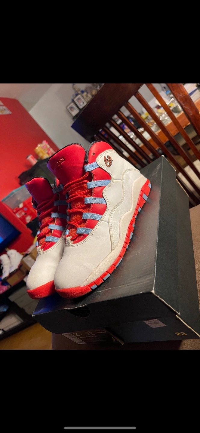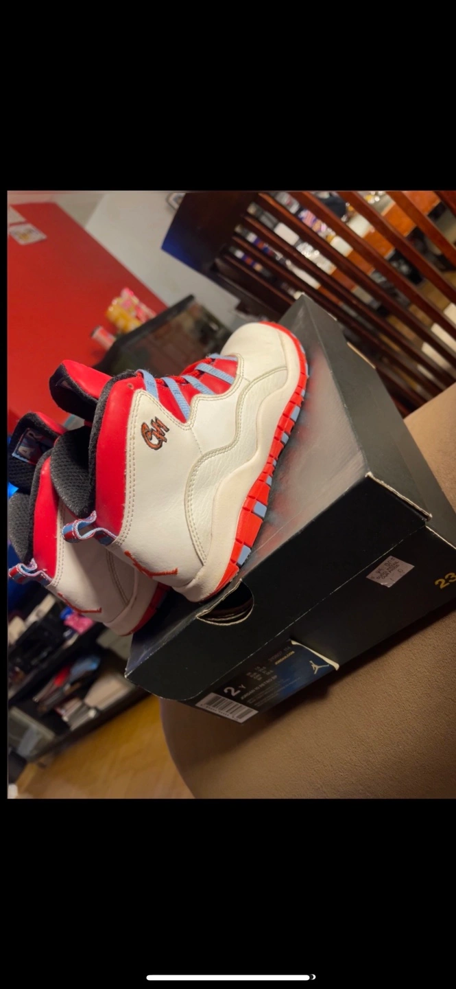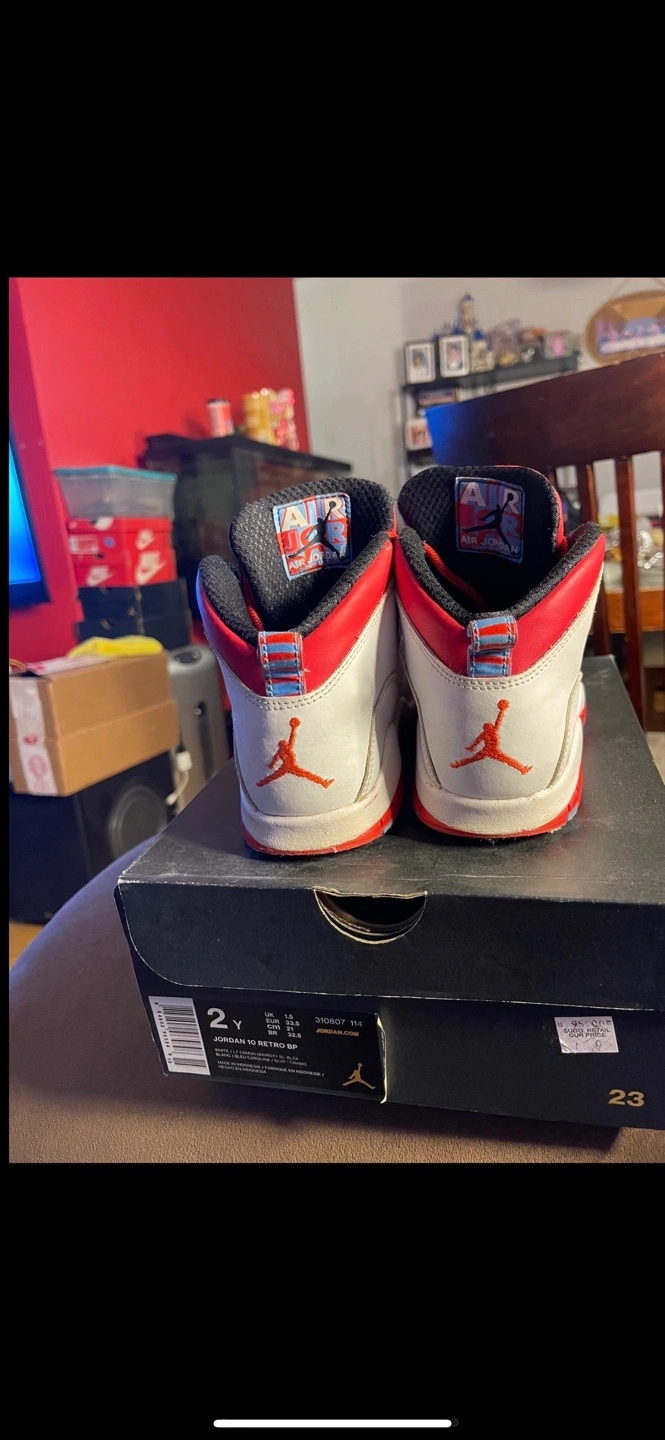 Kids' Air Jordan 10 Retro sneakers. Size 2Y. White, red, and light blue colourway. Comes in original box.