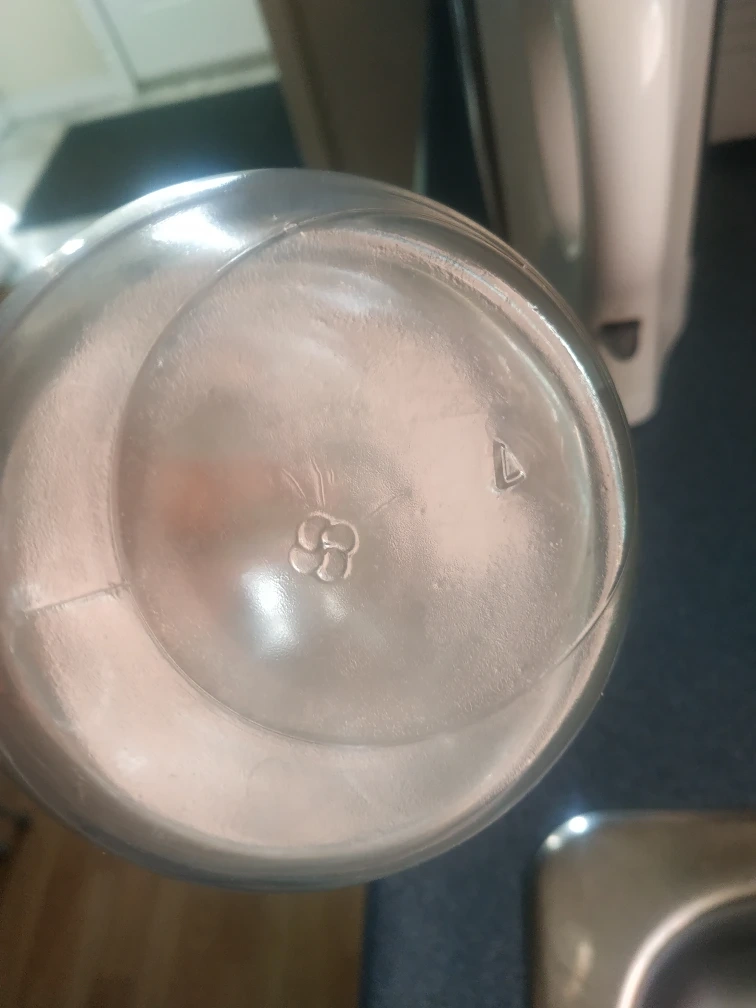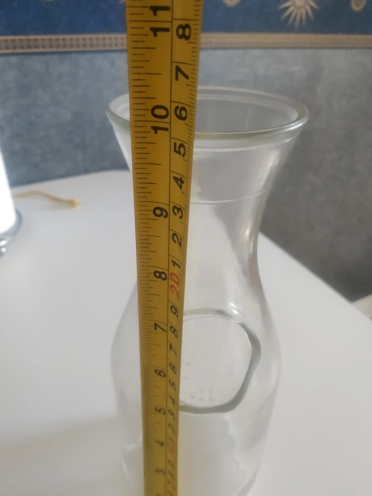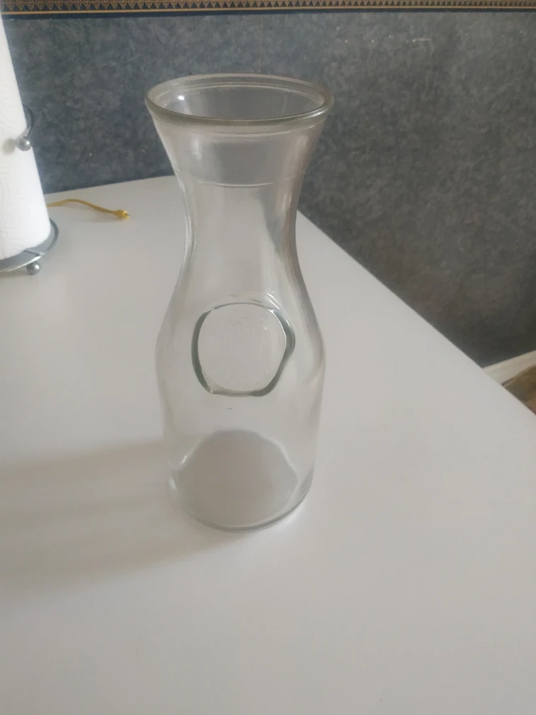 Clear glass beverage dispenser. Features a grape motif. Approximately 20 cm tall. Good condition.