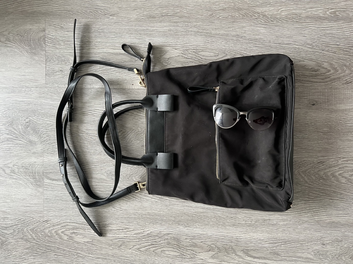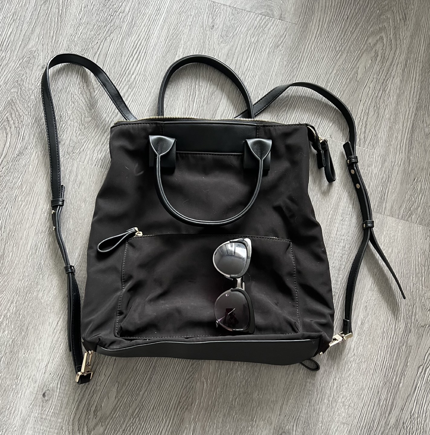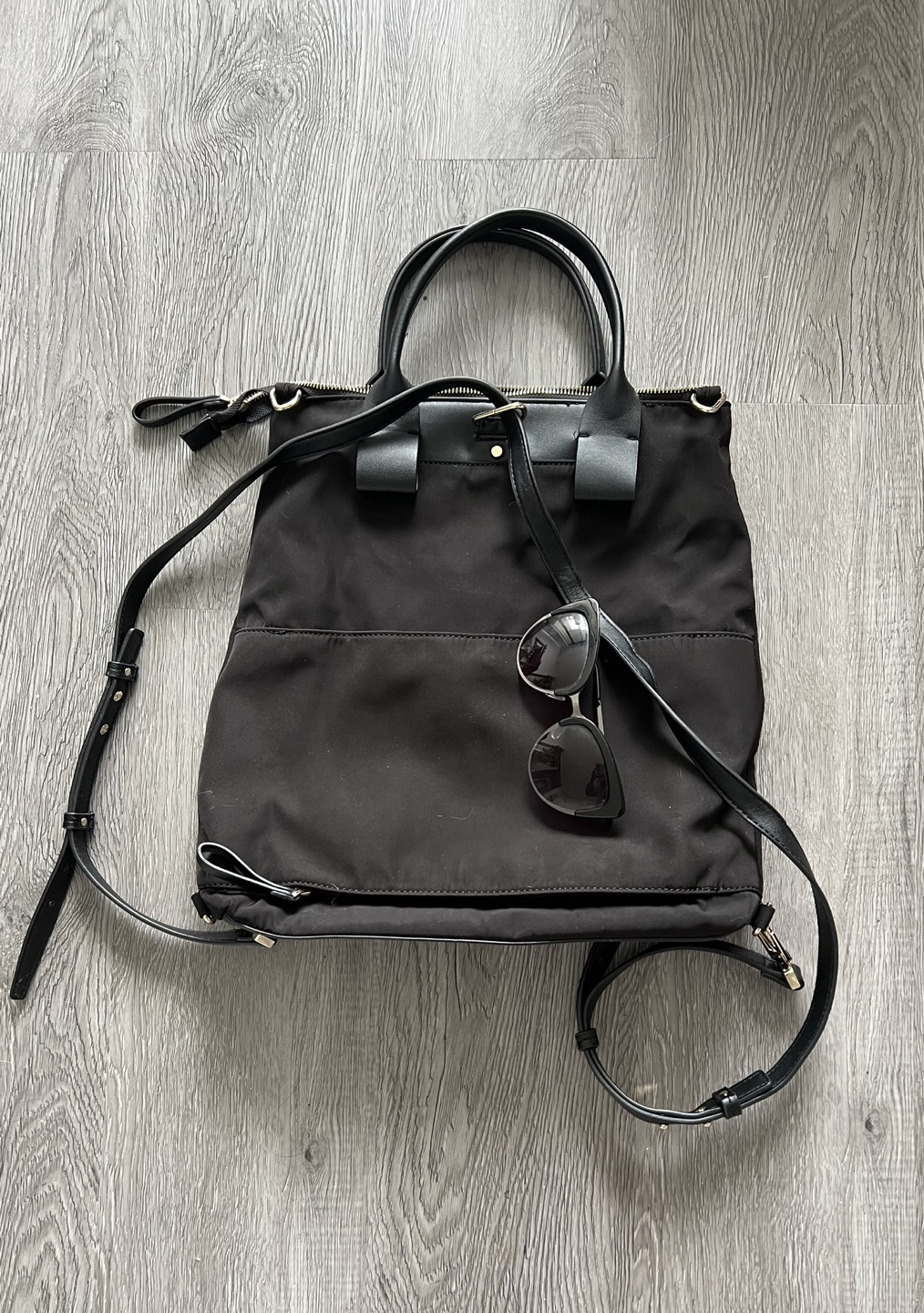 Convertible bag from Indigo - their retail was $60 + tax. The bag handle can be moved around so that it can be worn as a bag pack or a shoulder/crossbody bag. Idea for travel - it has a zipper at the bottom to let luggage handle slide into the bag. When zipped can be used as an extra pocket. Fits a 13 inch laptop, books and other items. There are 3 inner pockets (one zipper). In good condition. Cash only. Pick up please downtown Toronto See less