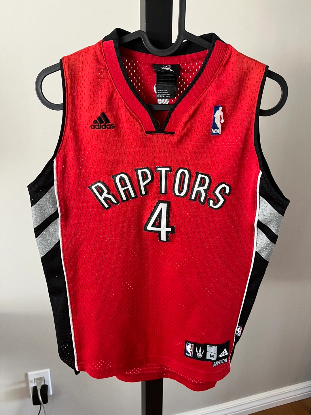 Youth size Medium Adidas Toronto Raptors jersey. Features Chris Bosh's name and number 4. Red with black and grey accents. NBA and Adidas logos visible. Pick up in Utopia, west of Barrie closer to Angus
