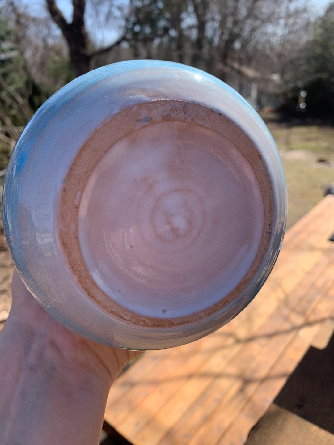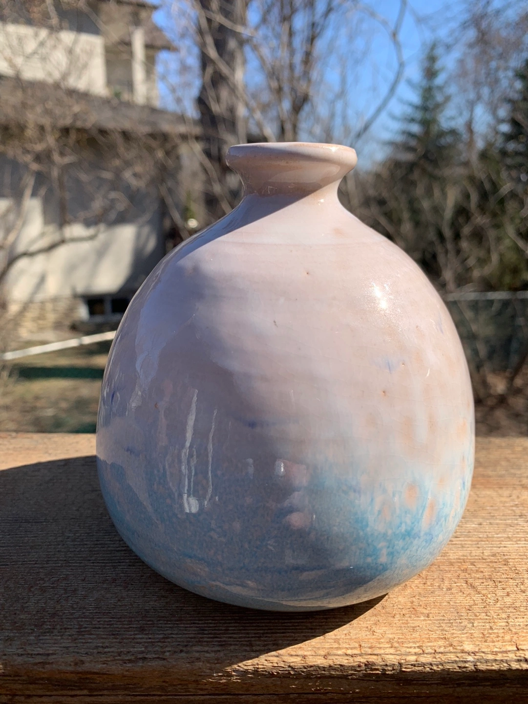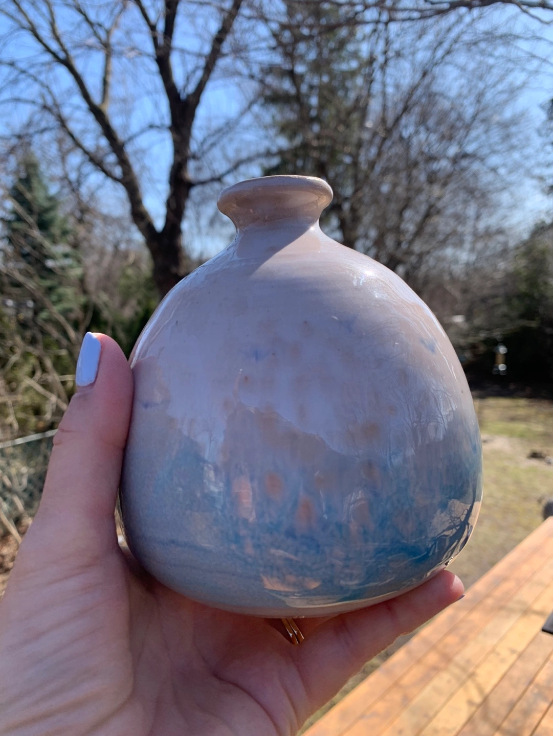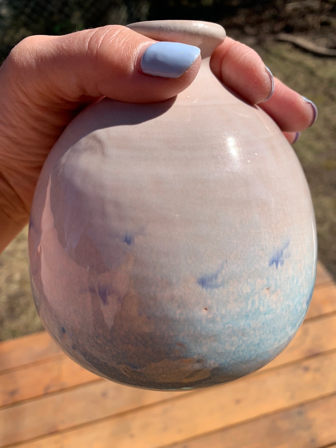 Adorable little pottery bud vase in a light blue and a creamy taupe palate. It has a round shape with a small neck. On one area, it almost looks like birds in the sky over a body of water! Perfect for small bouquets or décor. No markings on it but I believe it to be handmade. The glaze is really pretty!🩵 Cash only please.