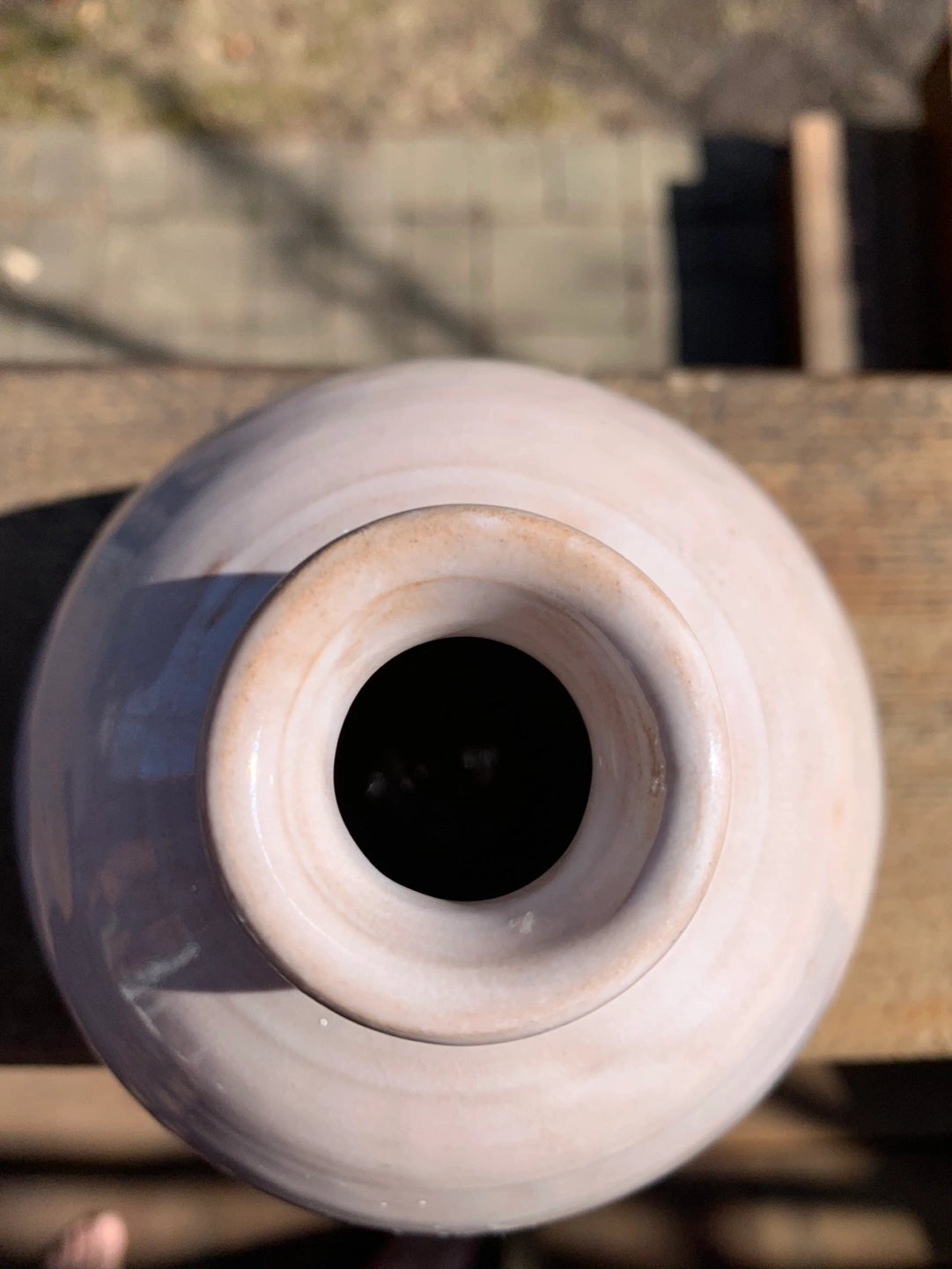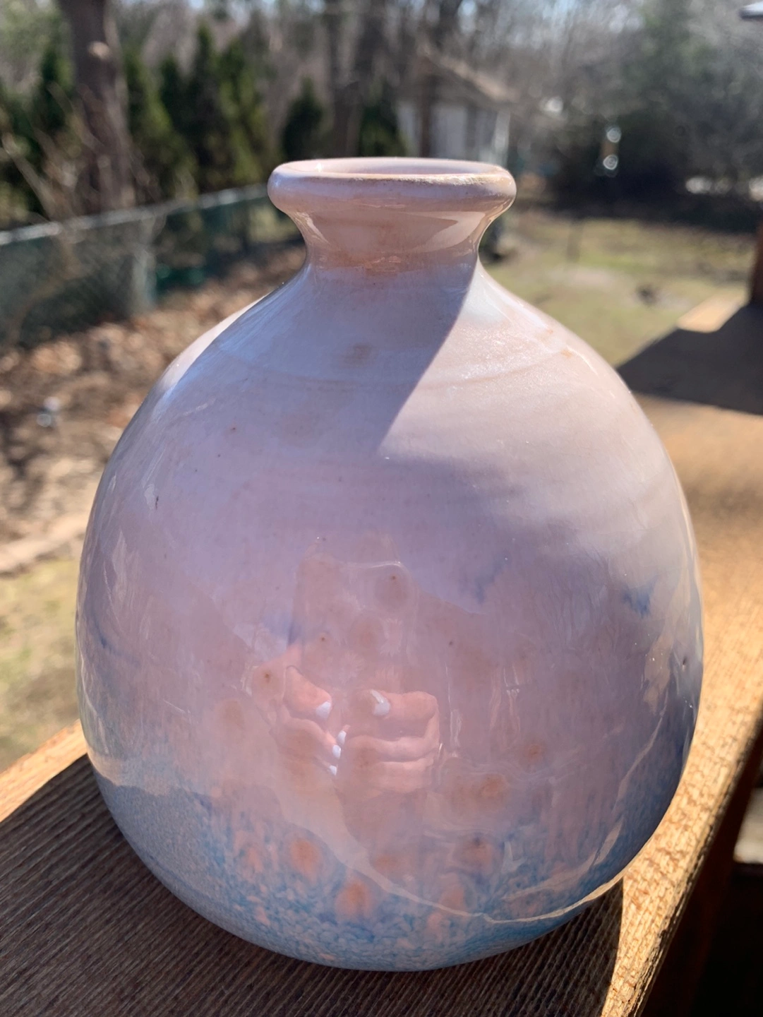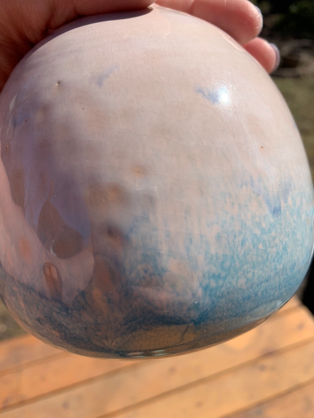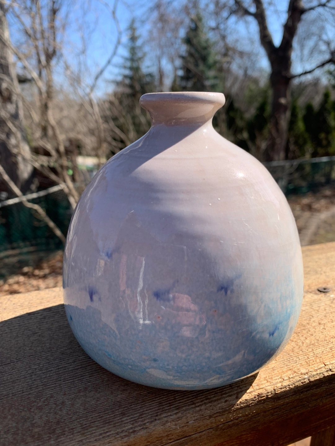 Adorable little pottery bud vase in a light blue and a creamy taupe palate. It has a round shape with a small neck. On one area, it almost looks like birds in the sky over a body of water! Perfect for small bouquets or décor. No markings on it but I believe it to be handmade. The glaze is really pretty!🩵 Cash only please.