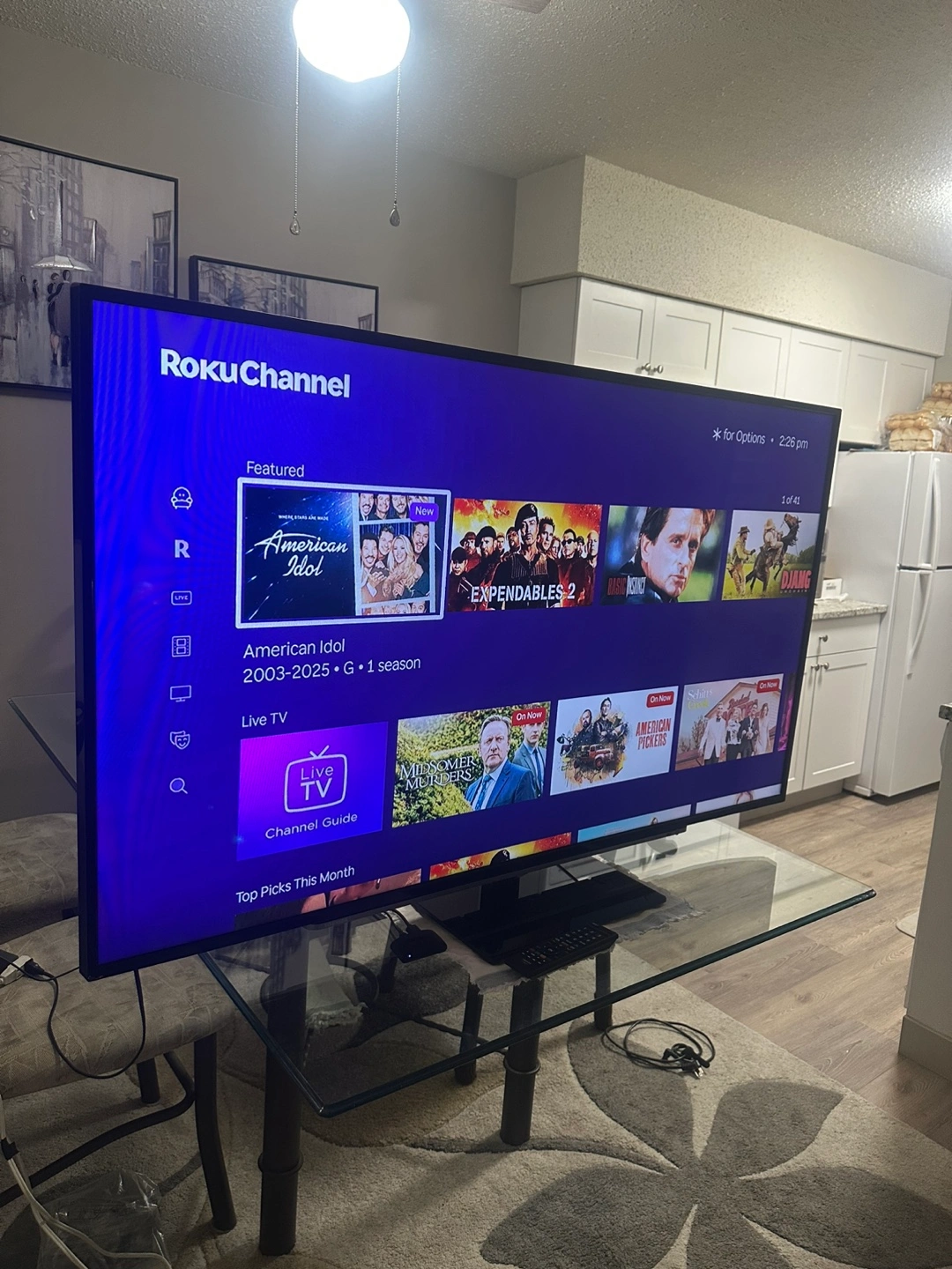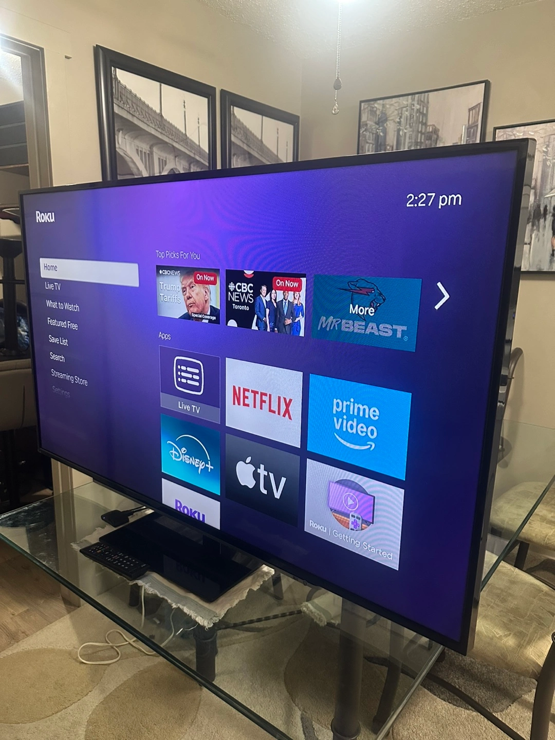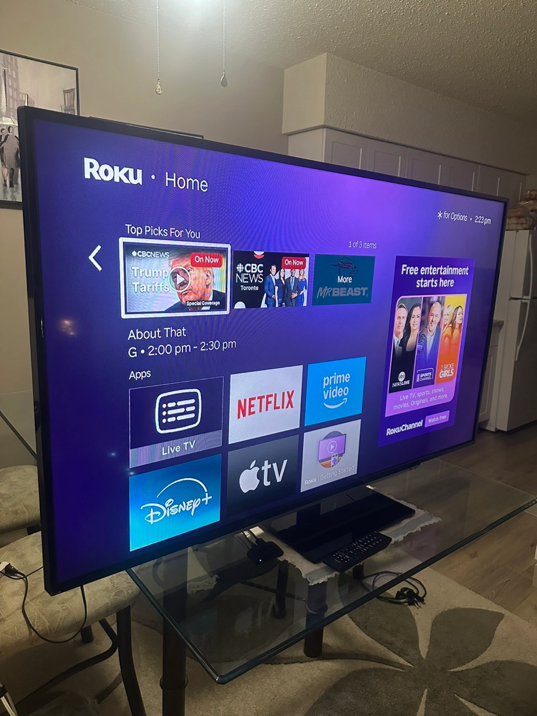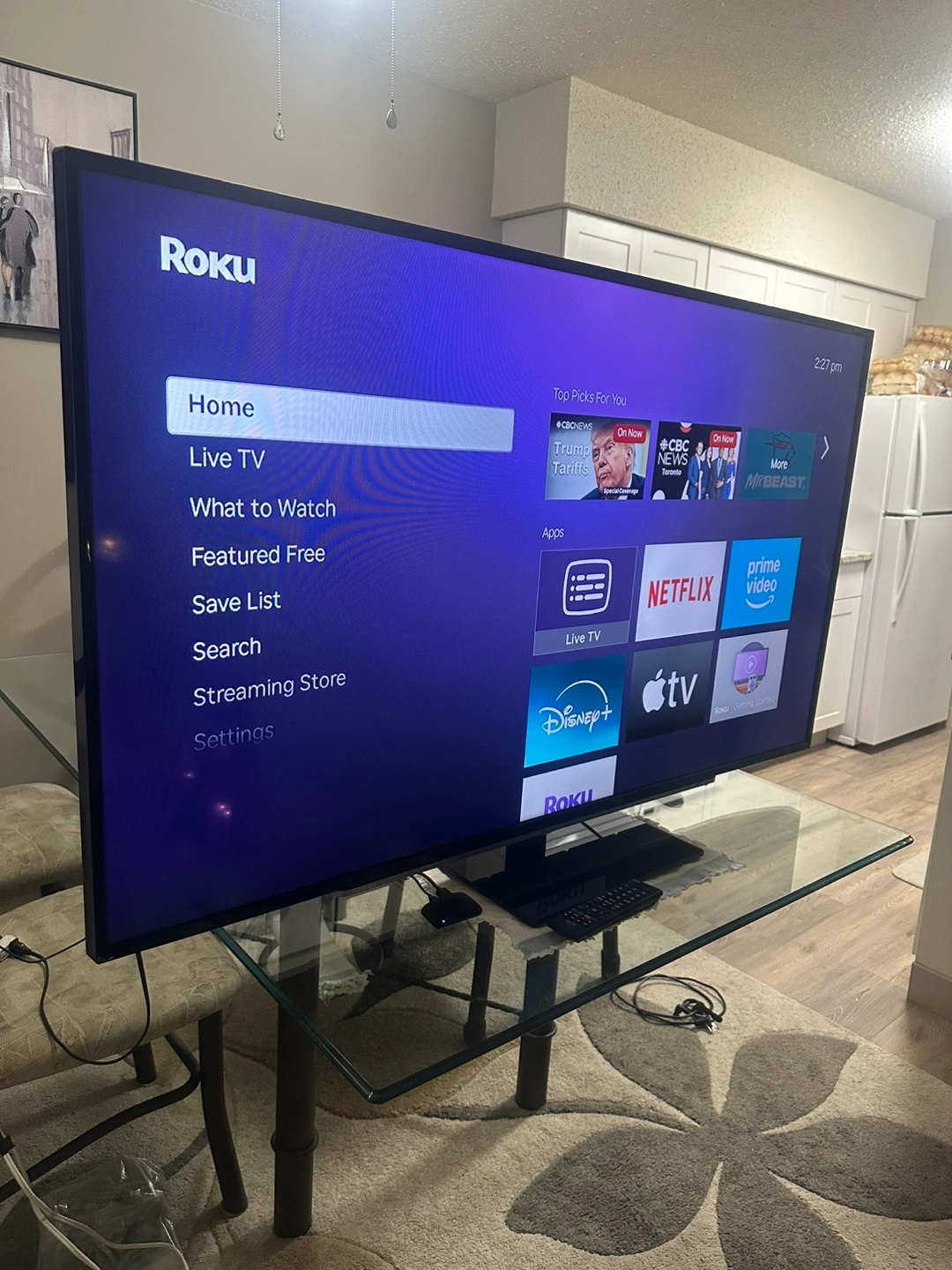 60-inch Toshiba smart TV (older model) in impeccable condition, delivering exceptional picture and sound quality. This well-maintained unit is free of dents or damages and features multiple connectivity options, including several HDMI, USB, and AV inputs/outputs. The TV is internet-enabled, allowing you to access platforms like YouTube and Netflix, and comes with an attached Roku box for streaming Roku channels as well as services such as Prime Video, Disney Plus, and more. It operates exactly as a TV should, offering a performance that feels brand new. Pickup is available in downtown red deer, with delivery offered for an additional fee. Please note that I will not respond to generic inquiries like "Is this still available?"—serious inquiries only, please.