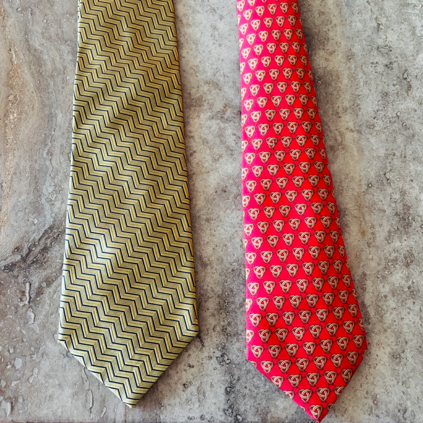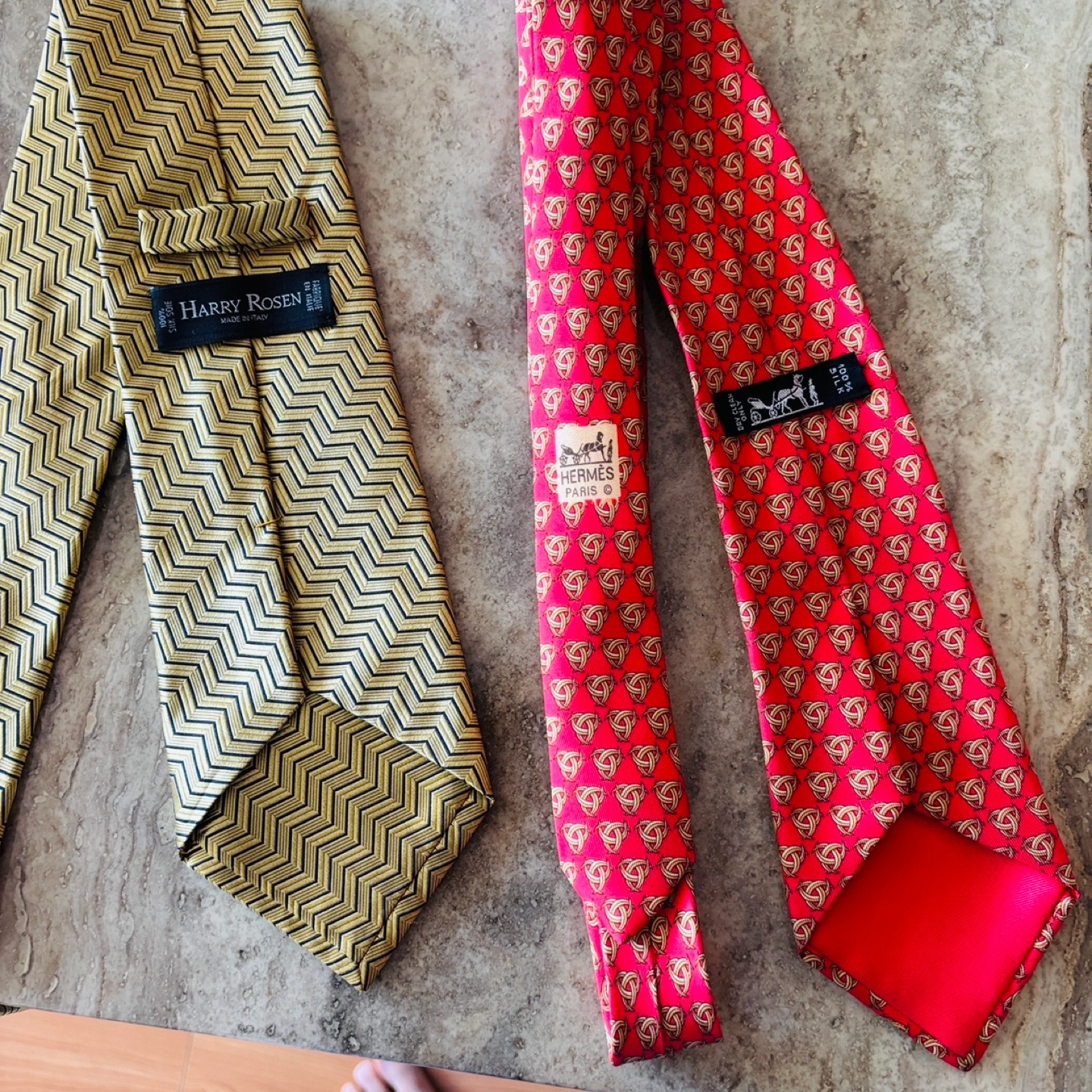 Add some sophistication to your wardrobe with this stylish duo! This listing features a Harry Rosen gold zigzag tie and a Hermes red pattern tie, perfect for adding a touch of class to any outfit. Both ties have been well-cared for and are in good condition, ready to elevate your look. * **Brands**: Harry Rosen, Hermes * **Material**: Silk * **Style**: Classic * **Condition**: Excellent Harry $60 Hermes’ GONE