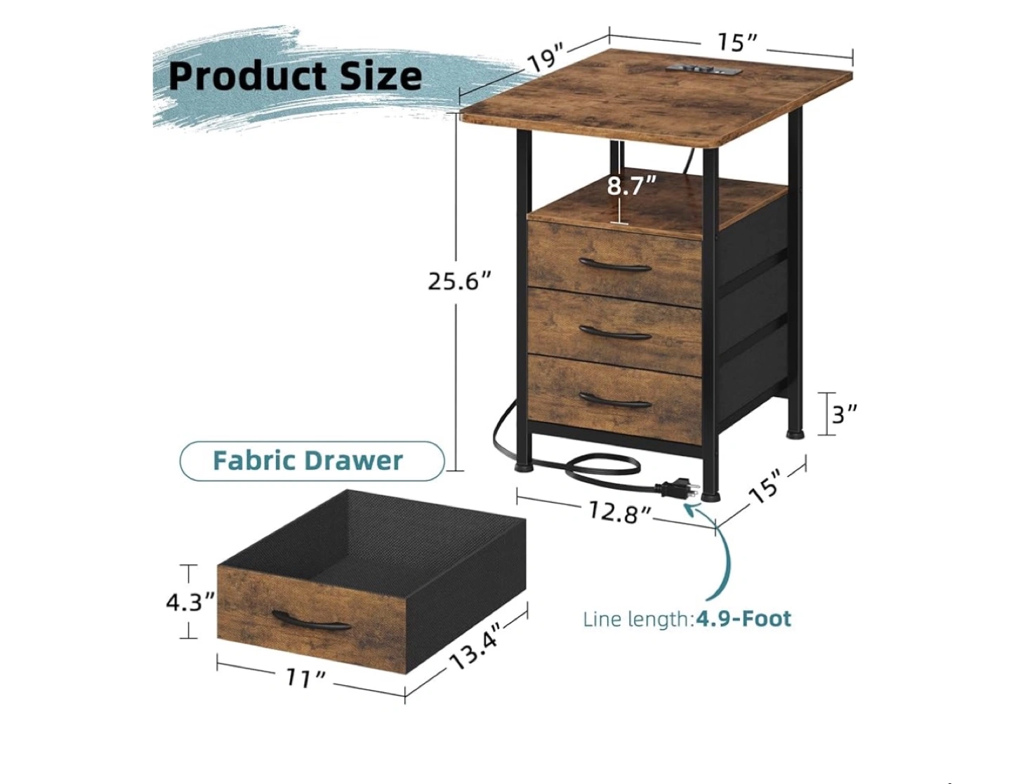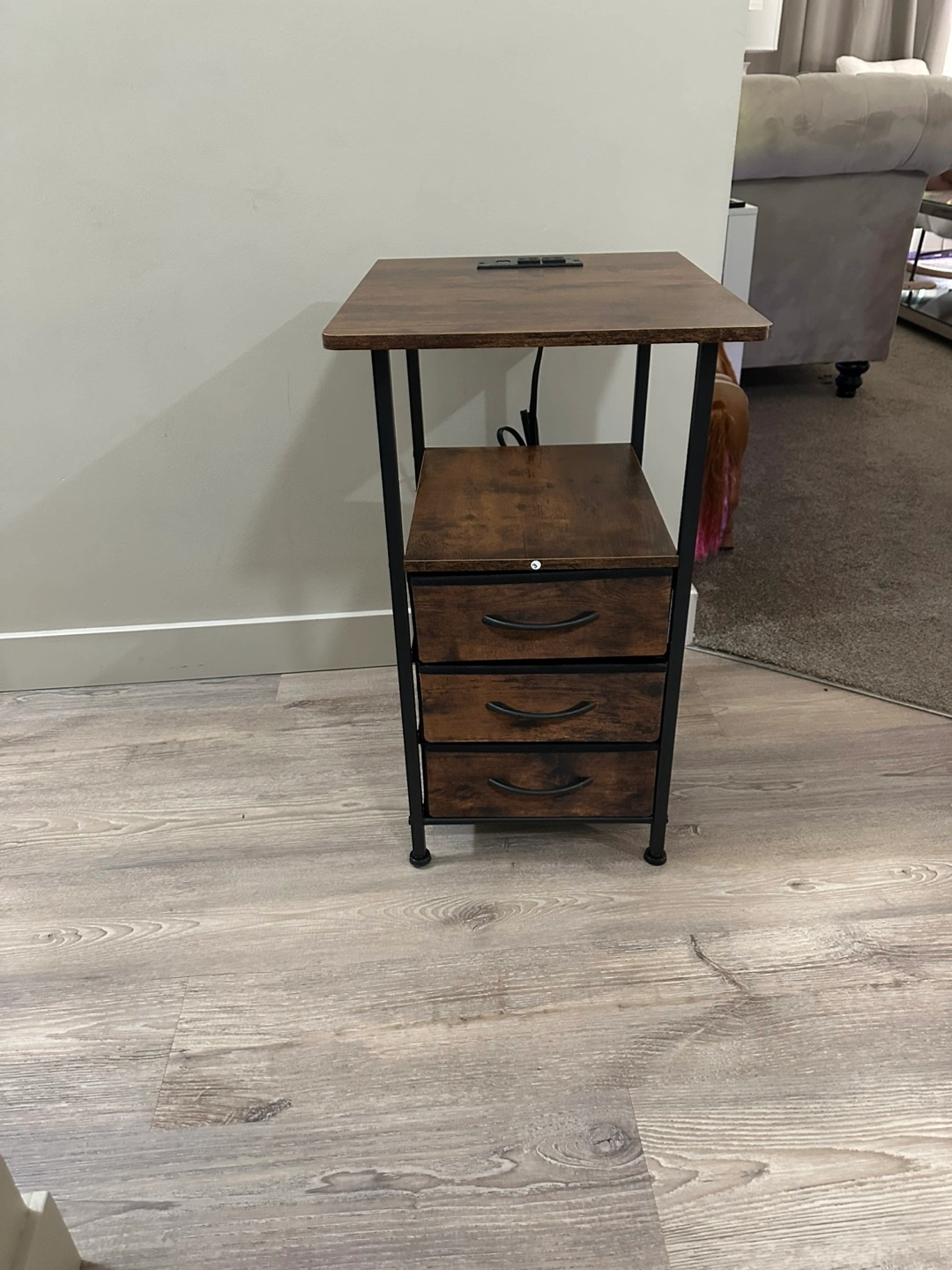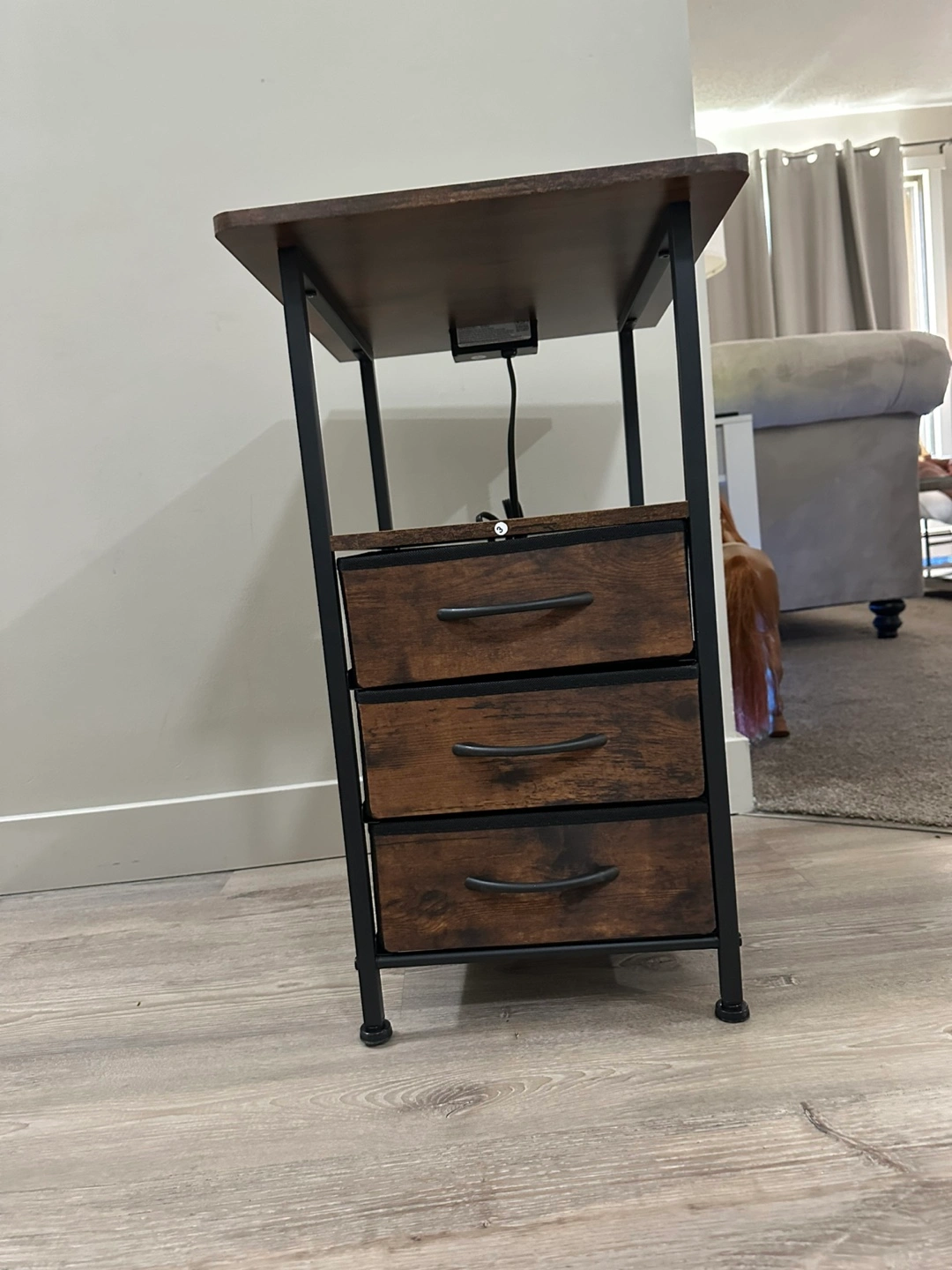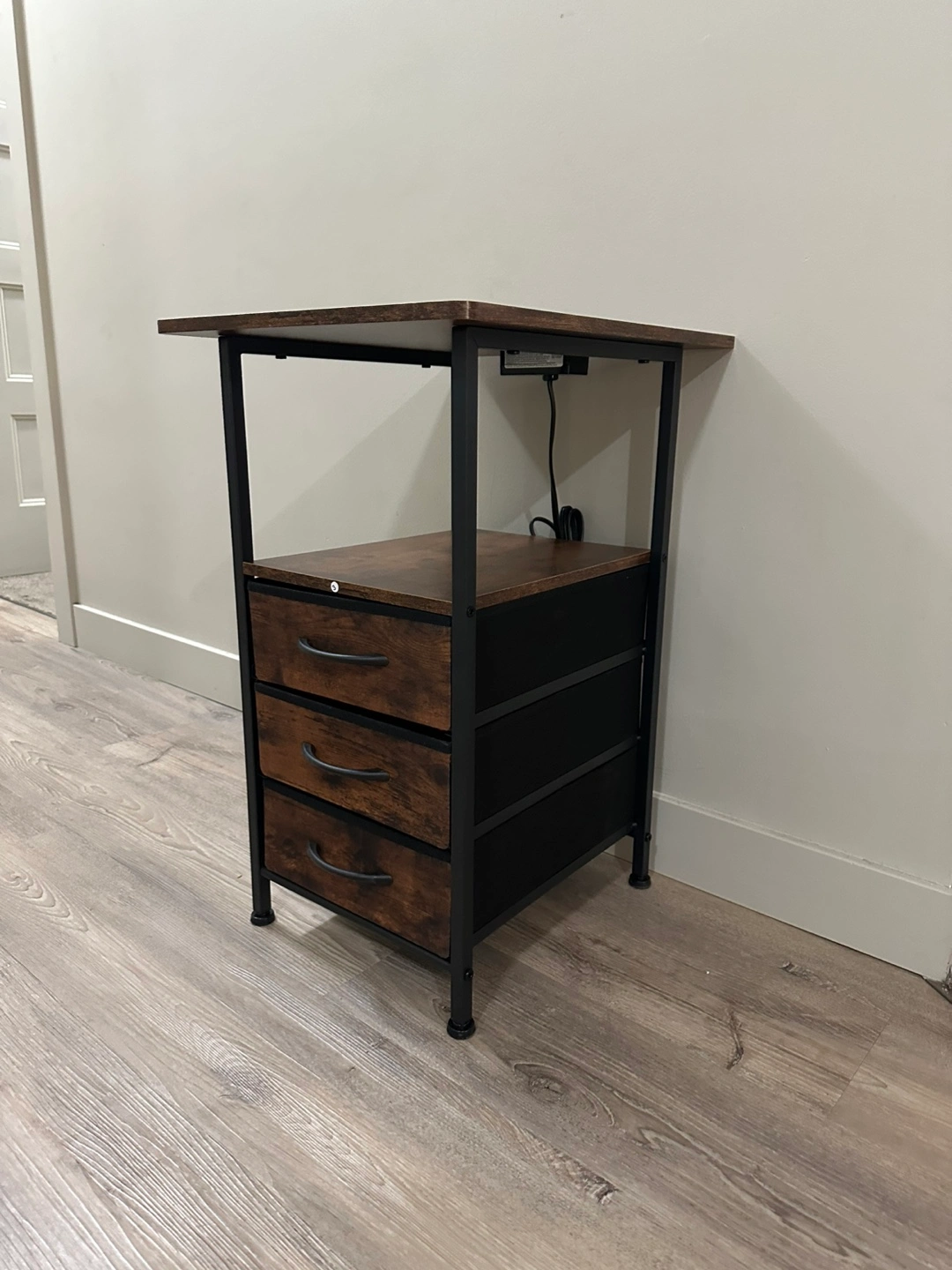 Brand new Night Stand featuring a spacious 19-inch tabletop, three fabric drawers, and a fast charging station. This bedside table set provides ample storage and is equipped with USB ports and outlets, making it a perfect addition to any bedroom. Finished in a rustic brown design, it's available for pickup in Red Deer. Serious inquiries only.