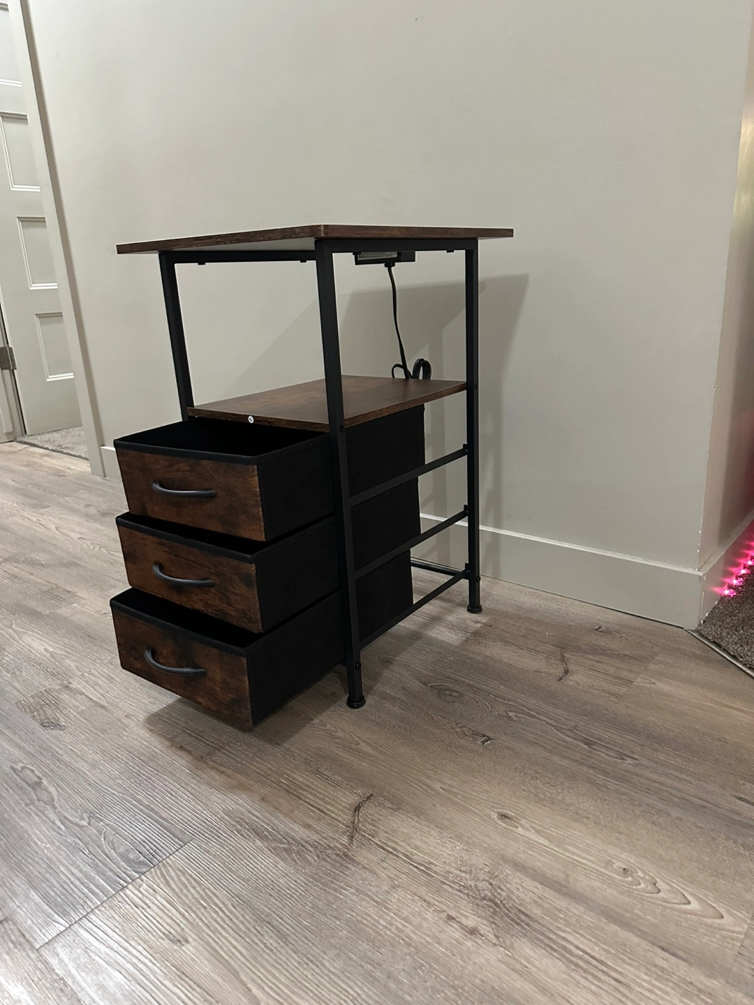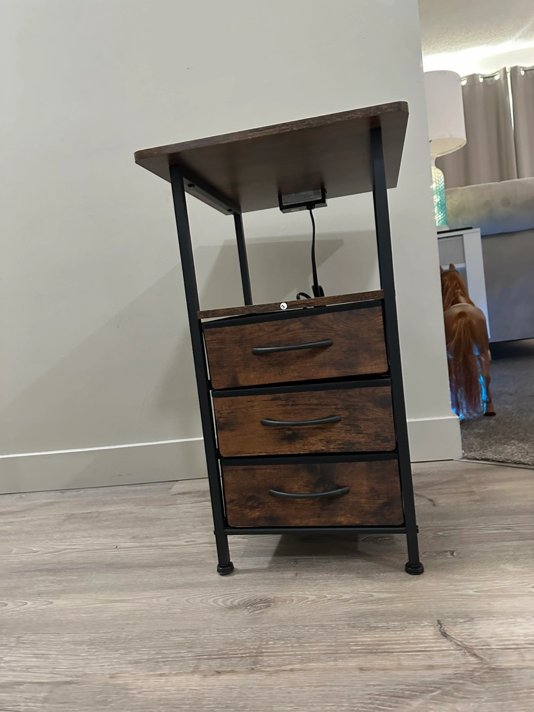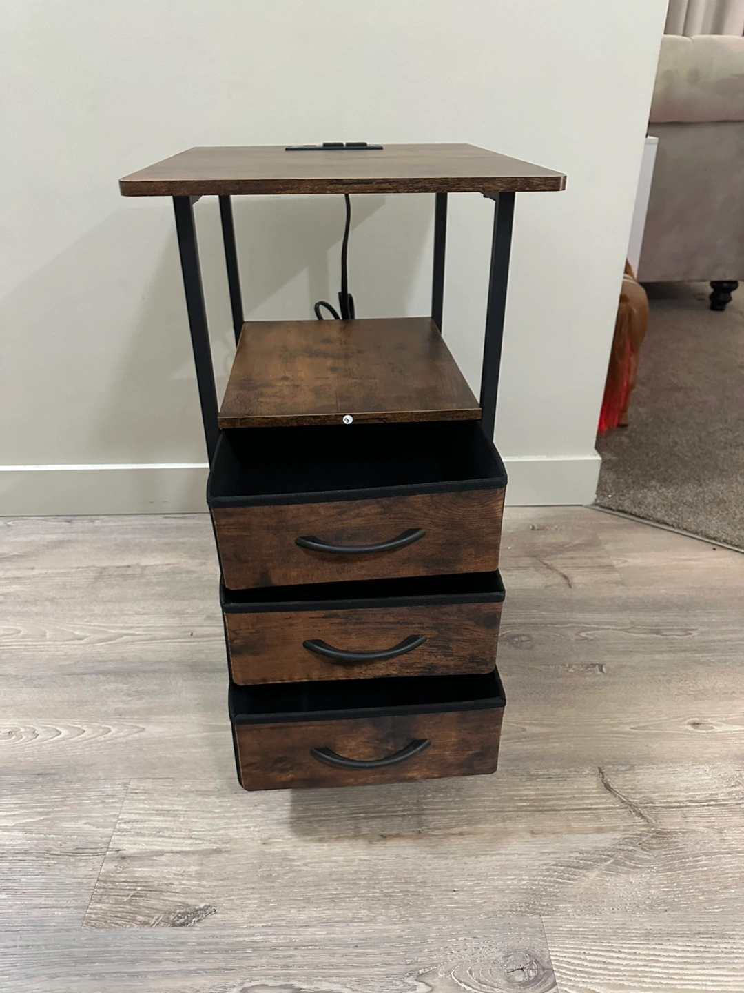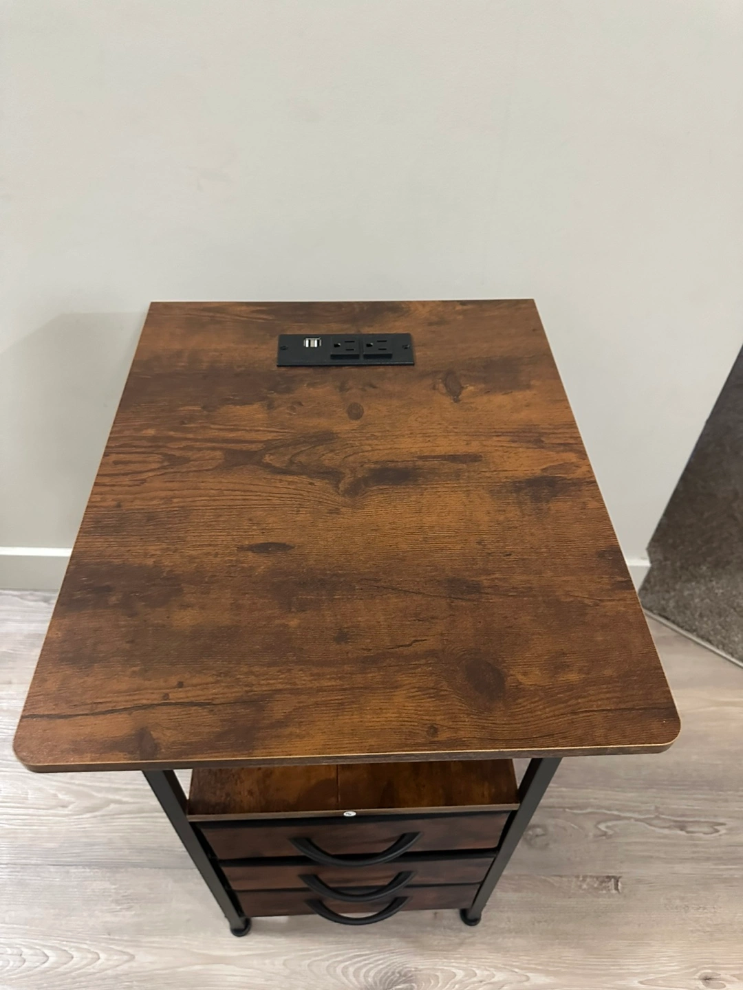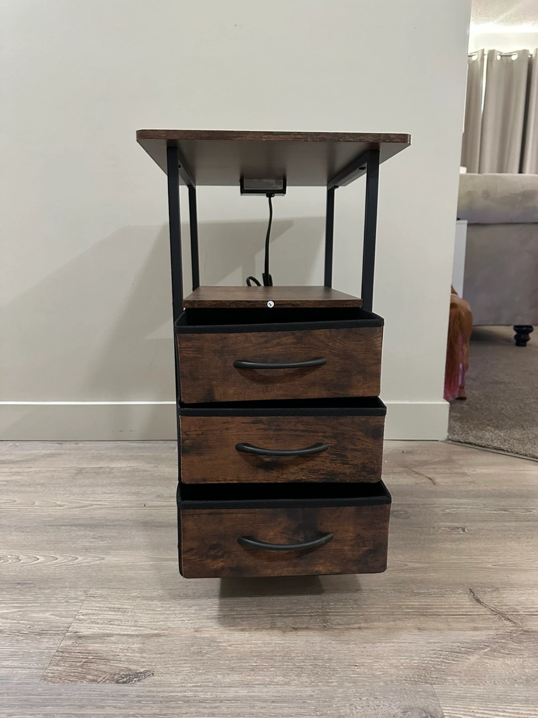 Brand new Night Stand featuring a spacious 19-inch tabletop, three fabric drawers, and a fast charging station. This bedside table set provides ample storage and is equipped with USB ports and outlets, making it a perfect addition to any bedroom. Finished in a rustic brown design, it's available for pickup in Red Deer. Serious inquiries only.
